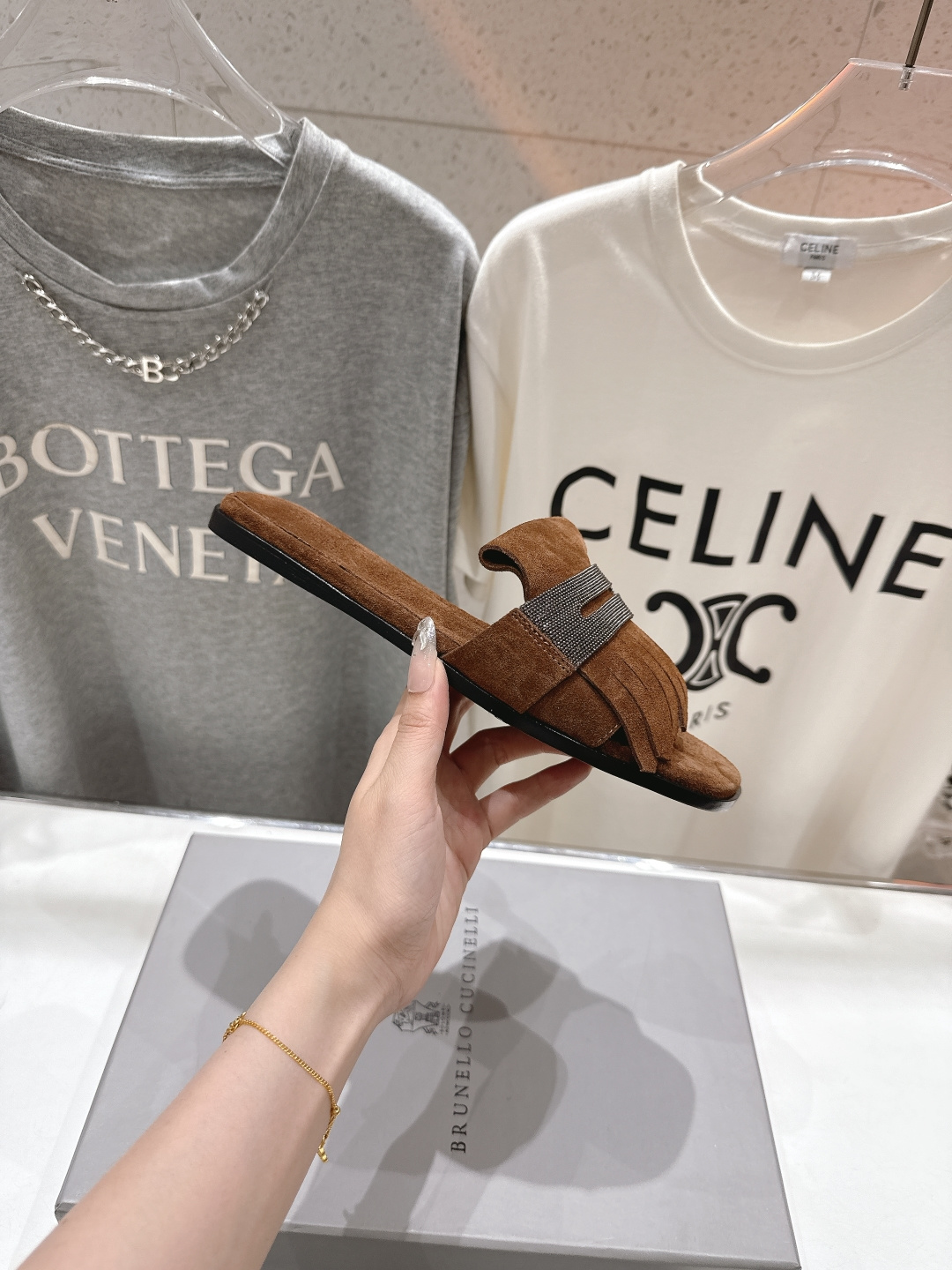 高版本出厂 Brunello Cucinelli 夏季新款BC平底流苏手工串联珠拖鞋 BC是意大利知名品牌,极简主义风格,复古又高级!简约又大气,属于非常耐看的款式!高级百搭之王,脚感很好很舒服!超级百搭!超级耐看!一年四季春夏秋冬皆适宜 ✔鞋面:进口高丝光牛反绒 ✔配饰:纯手工串联珠链配饰 ✔内里:丝绸羊皮 ✔大底:原版真皮大底 ✔码数:35-42(40/41/42订做不退换).