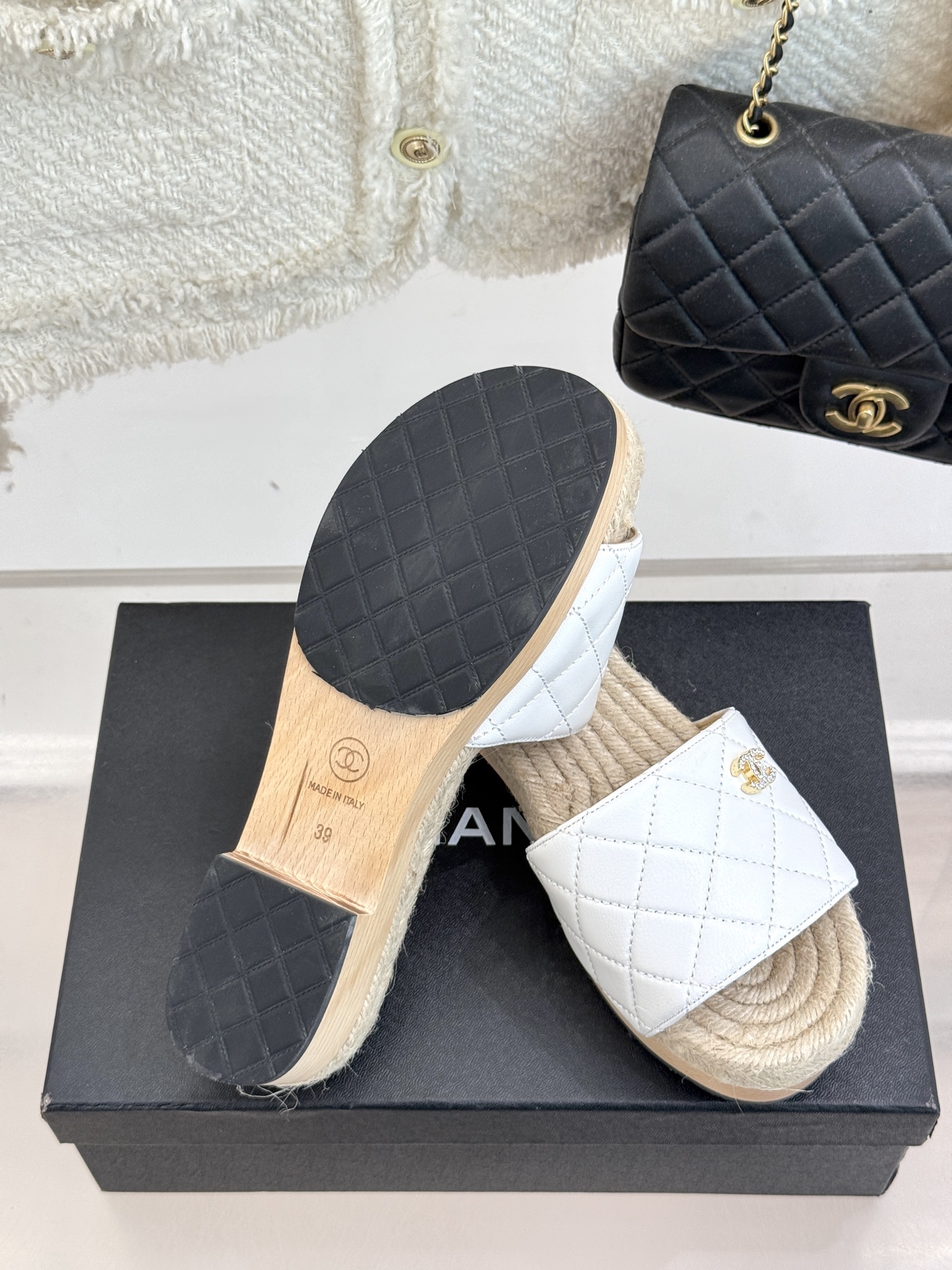CHANE* |小香25。春夏新品 麻绳菱格双C麻绳厚底拖鞋 经典菱格搭配木底元素 彰显高级 厚底在拉长腿方面真的yyds! 上脚超级显白 少女们的标配 时髦的小姐姐 必须人手必备。 面料采用原版定制皮料 内里采用羊皮 垫脚麻绳 原版定制木纹水台➕橡胶底片 Size:35-39(40/41定制不退换).