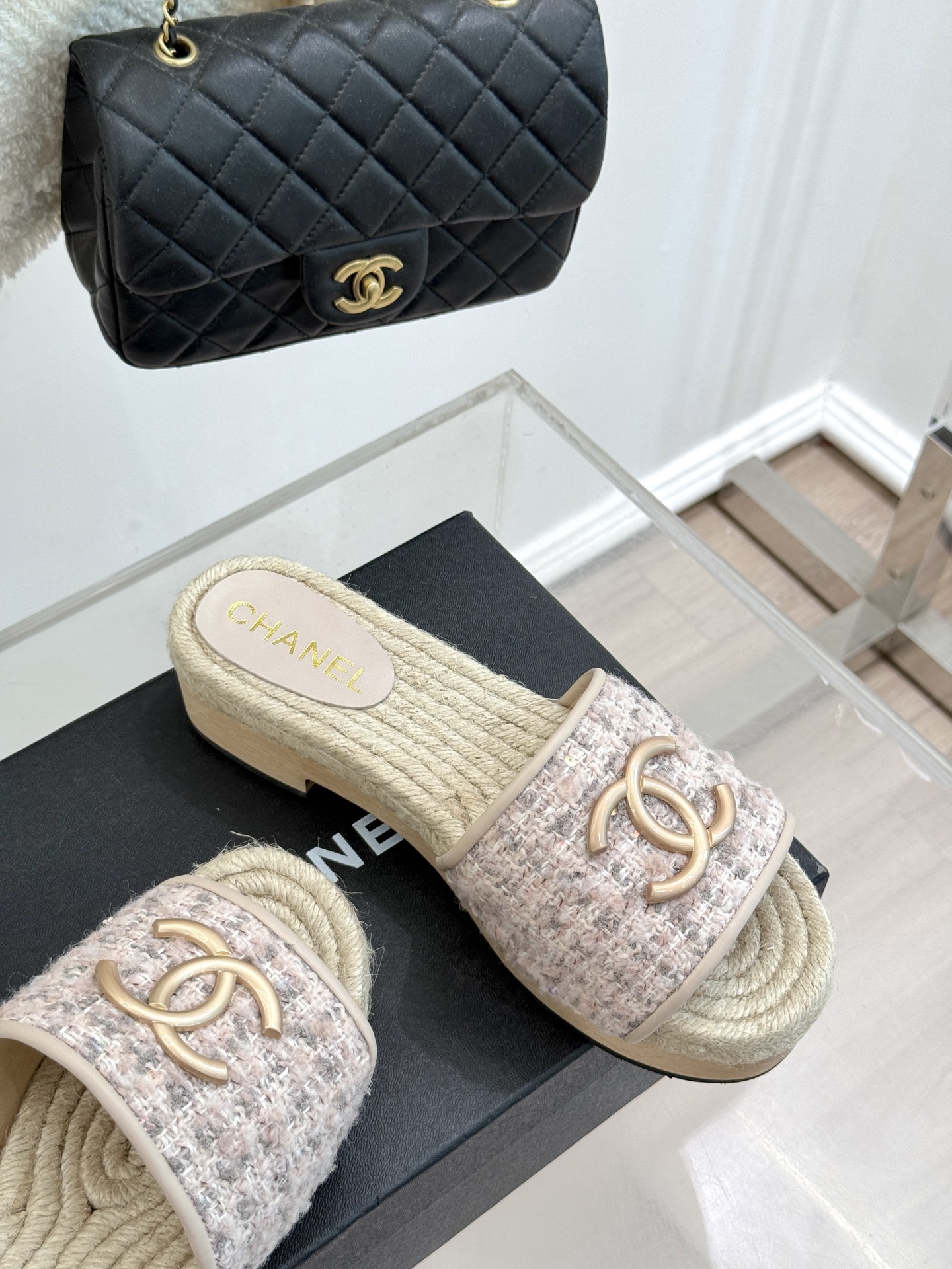CHANE* |小香25。春夏新品 麻绳菱格双C麻绳厚底拖鞋 经典菱格搭配木底元素 彰显高级 厚底在拉长腿方面真的yyds! 上脚超级显白 少女们的标配 时髦的小姐姐 必须人手必备。 面料采用原版定制皮料 内里采用羊皮 垫脚麻绳 原版定制木纹水台➕橡胶底片 Size:35-39(40/41定制不退换).