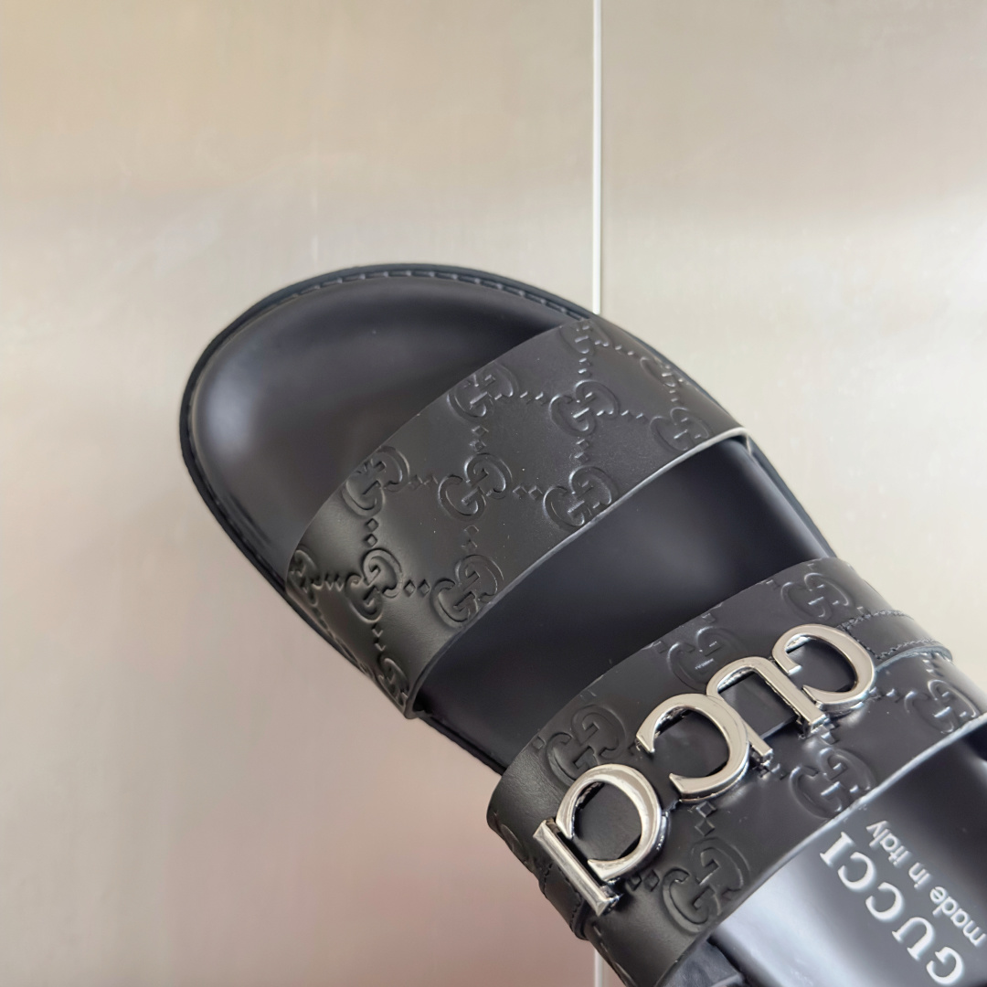 顶级版本:男款 Gucci古驰 最新 情侣款 双G 压花 一字 交叉 厚底 凉拖鞋 原版购入开发 做货 这款时尚感十足的凉拖匠心融蕴GG图案,将经典设计与现代风尚巧妙融合,尽显优雅精致格调。柔软的绒面材质鞋面凸显精致气息,贴合足部形状的鞋底则可带来全天舒适感受和百搭实用的穿着体验 配送专柜精美包装🛍📦 ▪️ 面料:原版进口压花皮革 ▪️ 内里:原版进口柔软皮革 ▪️ 鞋底:原版开模防滑橡胶大底 ▪️ 底厚:2.5CM ▪️ Size: 男款38-45 .