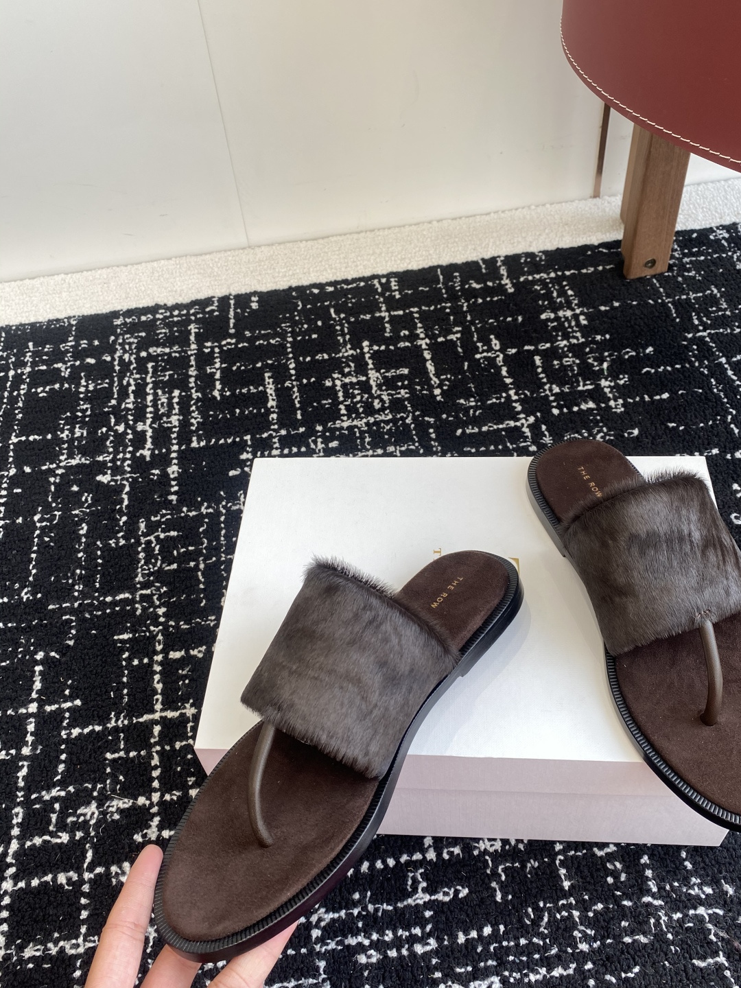 东莞代购级 新款 25ss The Row夹脚拖鞋 第一眼看到这个鞋子给人感觉很简单不起眼,其实上脚很好看,主要也好穿,整个鞋子非常柔软不磨脚。 真皮拖鞋面料进口小羊皮/进口马毛 内里:进口全粒面混种羊皮 大底: 进口意大利双层真皮大底➕ tpu射出高级防滑,中底进口高弹 柔软舒适不生硬 延续了一贯极简风格,采用全皮套包制作工艺,超级废料,非常柔软亲肤,脚感方面完全不可担心,好穿是必须的,对脚感要求高的必眼入它 尺码:35 36 37 38 39 40 (40不退换)全套包装.