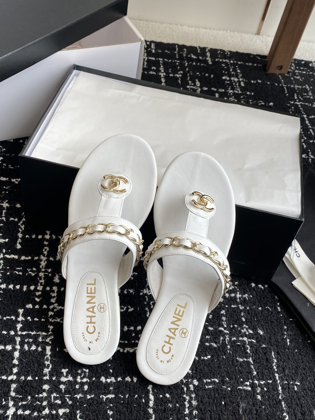 代购级(官网同步✈️盒包装) CHANEL 香奈儿 25ss 夏季新款 夹脚人字拖 海滩必备款 Chanel2025香奈儿最新爆款 夏季夹脚拖鞋、百搭显脚瘦气质款,颜值爆棚的一款拖鞋,任意搭配都很绝!懒人拖鞋值得推荐 鞋面:进口羊皮 舒服 内里:混种羊皮 大底:意大利真皮大底 Size:#35-41(40 41定制不退换).