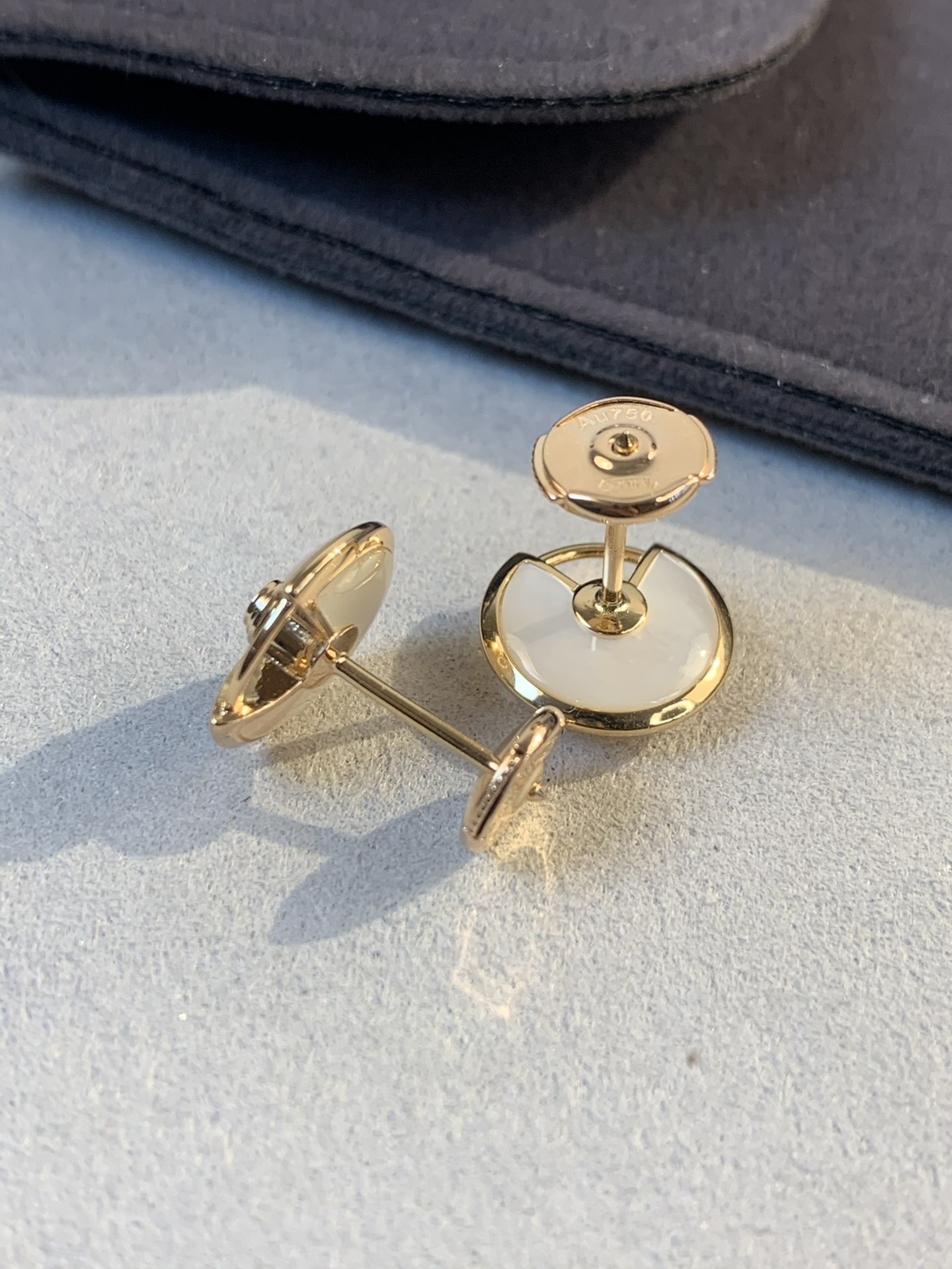 老卡家经典护身符耳钉,Amulette de Cartie*,令人心驰神往的珠宝系列,以珍稀宝石雕琢开启幸运的护身符,简约而不失优雅,如果DIVA的裙子是一种曲线美,那么护身符就是一个轻盈剔透的圆形宝石。圆润光滑的吊坠在胸前熠熠生辉,仿佛释放了梦想,珍藏了愿望💖