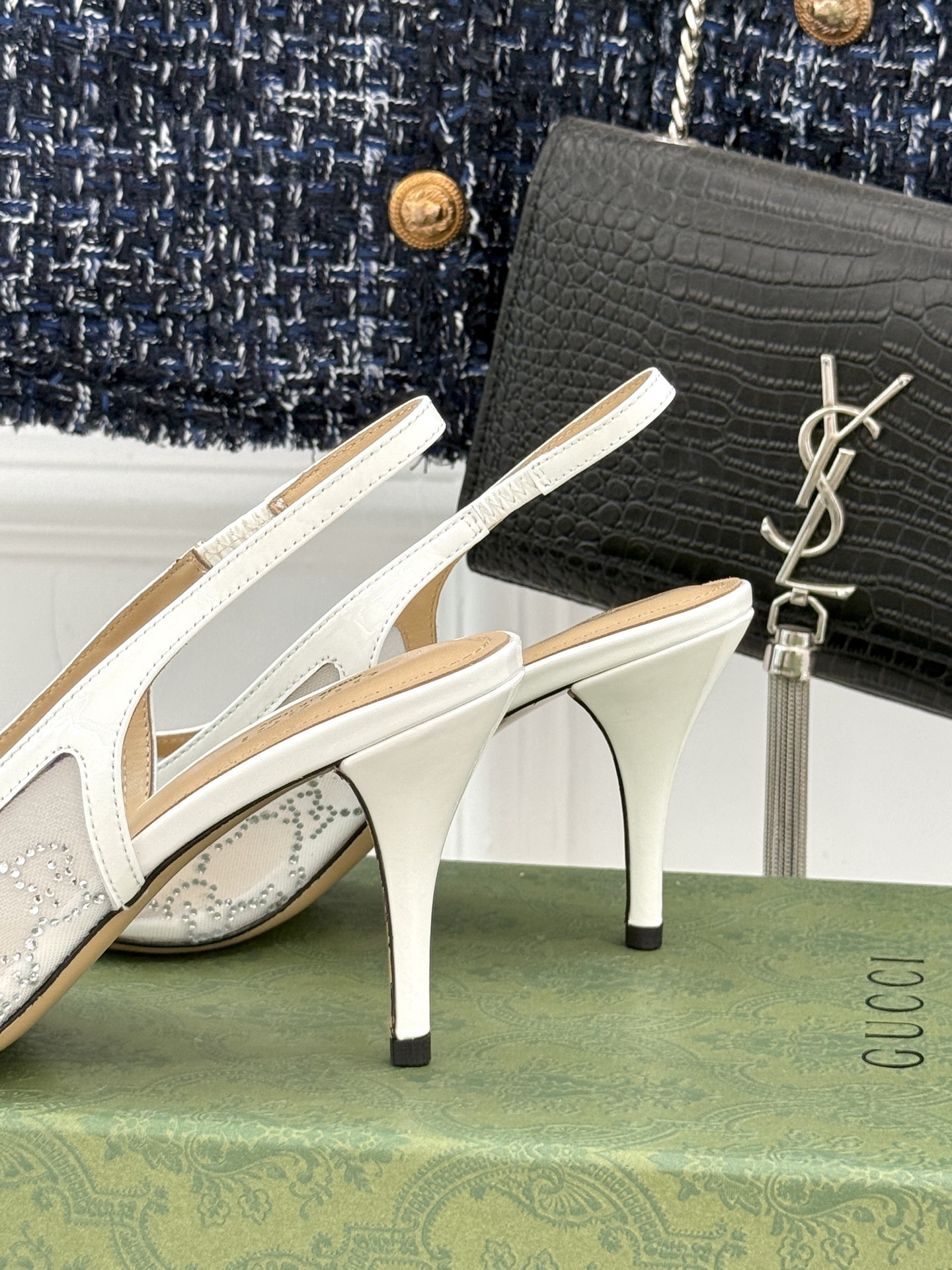 Gucci/古驰经典水钻网纱尖头高跟后空凉鞋