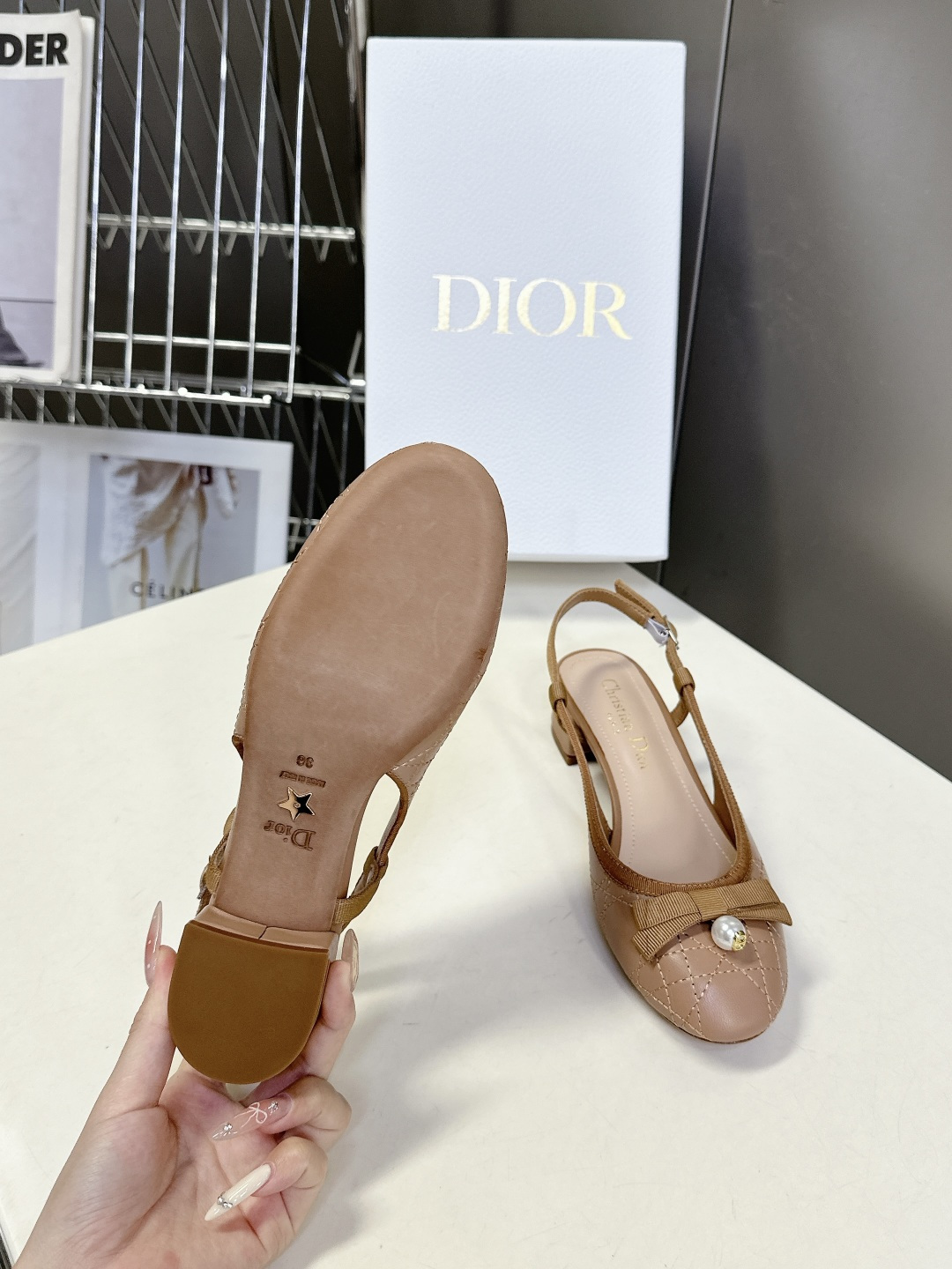 时尚优雅,饰以白色树脂珠饰和 CD 标志 圆头设计与粗跟相得益彰,可为本季的各式造型增添高雅气质💫材质完美还原,随意对比哦~内里小山羊皮,耐穿有质感。开模定制树脂珍珠,穿脱方便优雅又质感,小小的特别精致🤍皮革鞋底饰以 Christian Dior 的幸运星符号,原版包装配套,代购级出品,细节安心 鞋面:混种羊皮➕珍珠扣 内里:小羊皮意大利真皮大底 跟高:3.5CM Size:35-41(40 41 可定做).