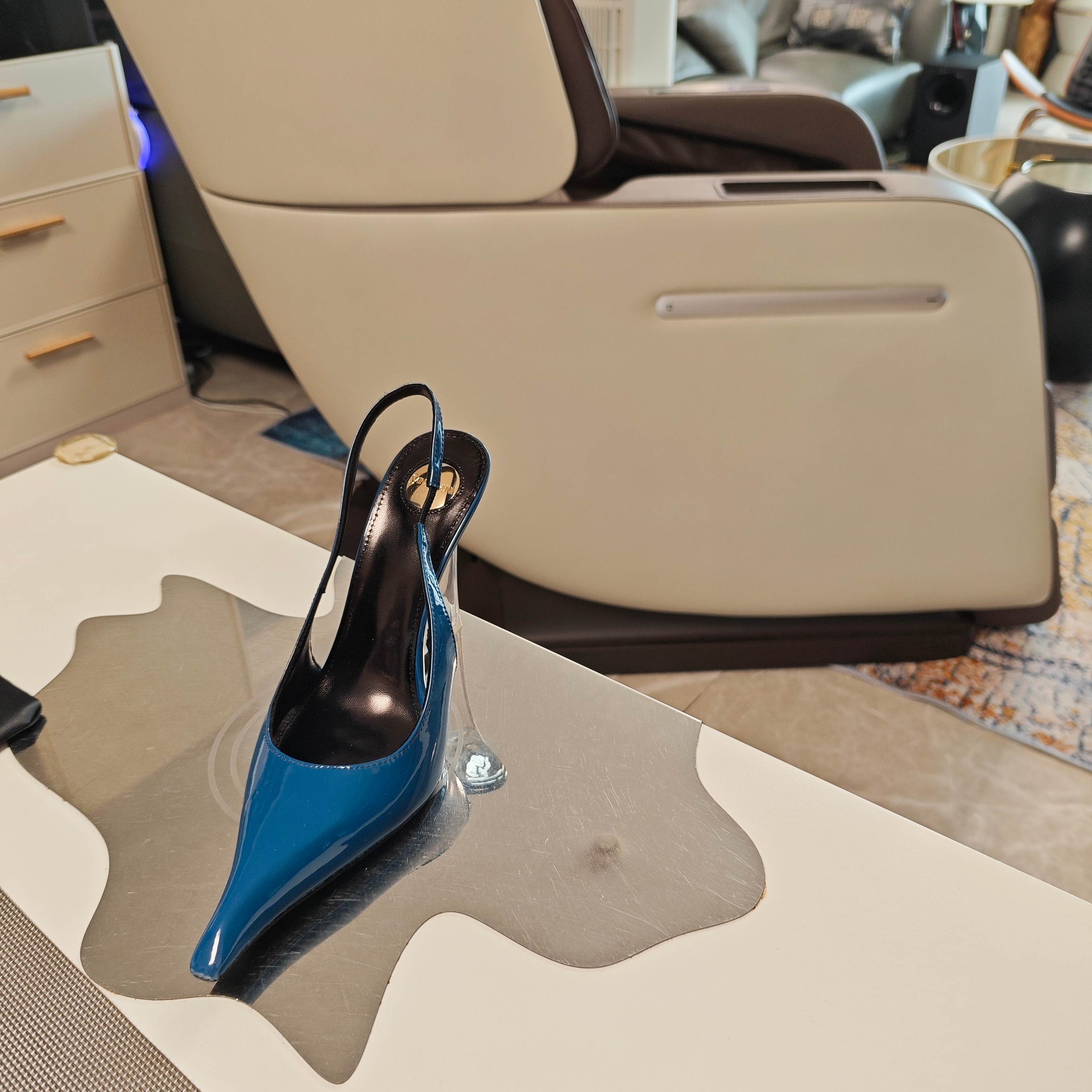 鹰嘴形状尖头+亮面漆皮鞋面 + 透明坡跟斜高跟+性感尖头鞋楦,集性感,高贵,高端,大气于一身!凸显品牌醒目的廓形和精湛的剪裁。