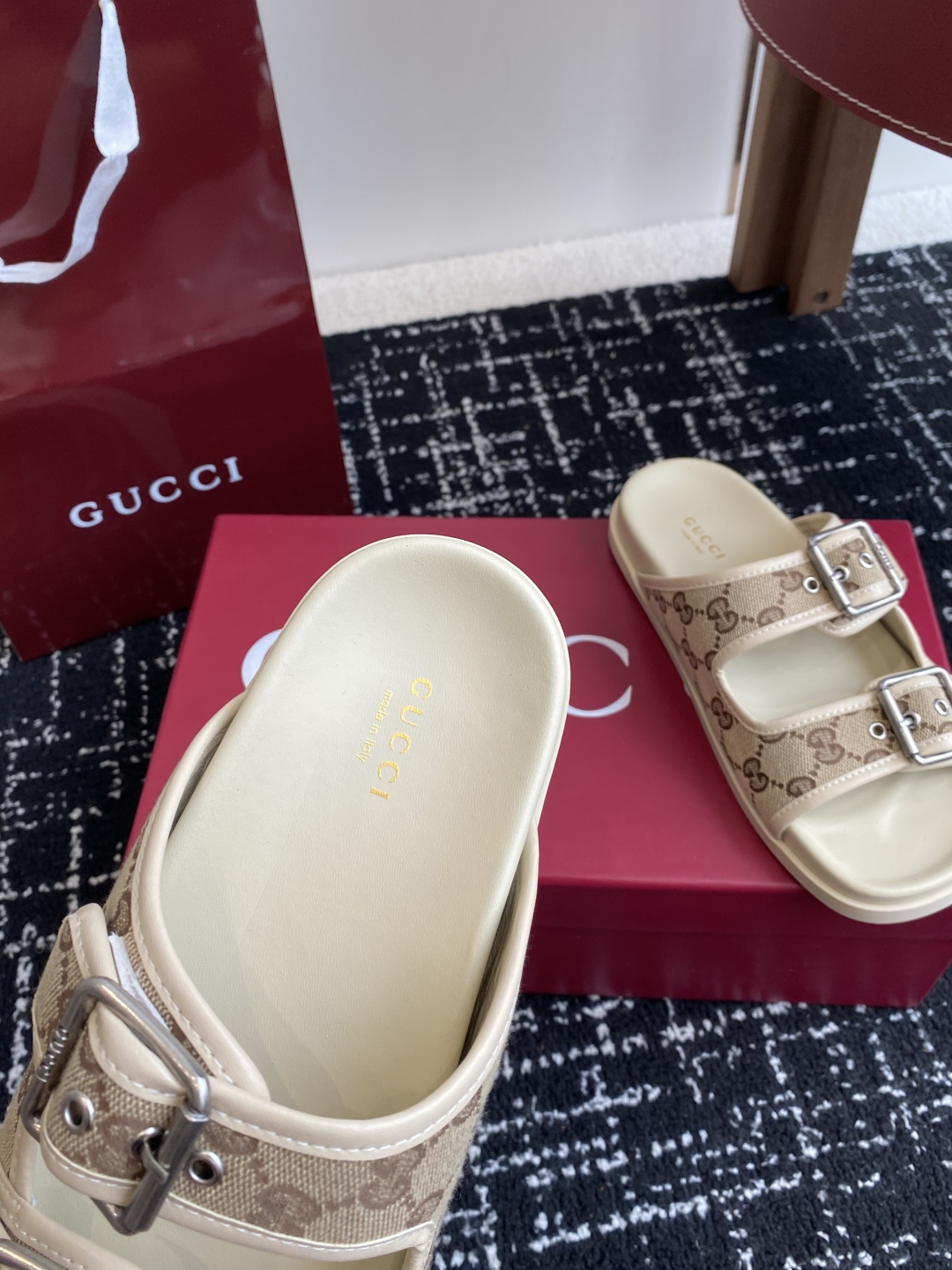 代购级 GUCCI 25ss 春夏系列GG菱形 沙滩平底拖鞋 由经典真皮电绣菱形条纹+配双G金属扣作为品牌的标志性象征制作而成打造令人惊艳的作品焕新演绎! 面料:原版定制进口牛皮/老花牛仔 内里:进口牛皮 大底:模具进口PC橡胶组合底 Size: # 35-40(40订做不退换) .
