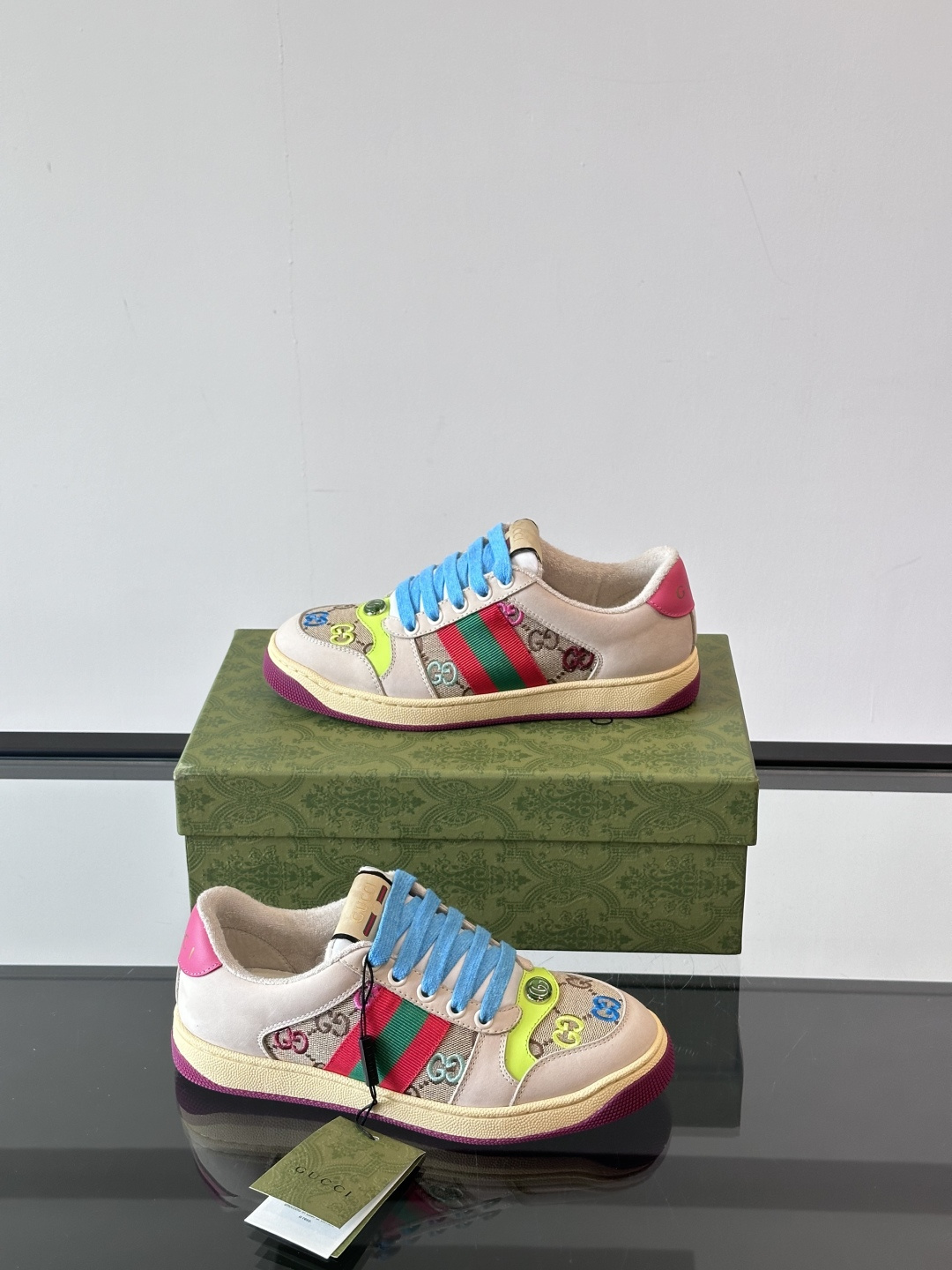 Gucci Screener 脏脏鞋新配色🩷❤️🧡💛最新配色的多巴胺风也太好看了吧‼️男女鞋都超爱的😄。Screener系列名称的灵感来源于体育运动中的防守动作,运动鞋的设计从20世纪70年代的经典运动鞋不断汲取灵感。新款运动鞋采用经典Original GG帆布材质,侧边点缀别致条纹织带,复古Gucci标识平添品牌内涵。