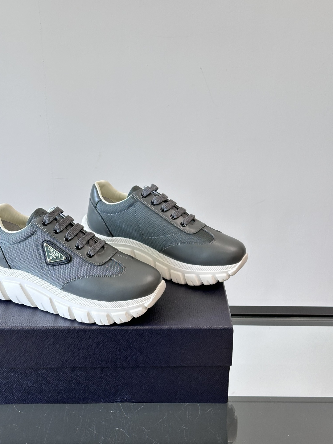 Prad*男士新款柔软皮革休闲运动鞋,这款运动鞋采用纳帕牛皮➕网面打造,皮质柔软细腻,纹理自然,提升透气性能,外侧橡胶三角形徽标点缀鞋身,鞋舌及后跟饰以品牌字母logo细节,超轻质6cm凹凸纹橡胶厚底,侧面配有PRADA字母徽标,牛皮内里,脚感舒适,精致百搭!