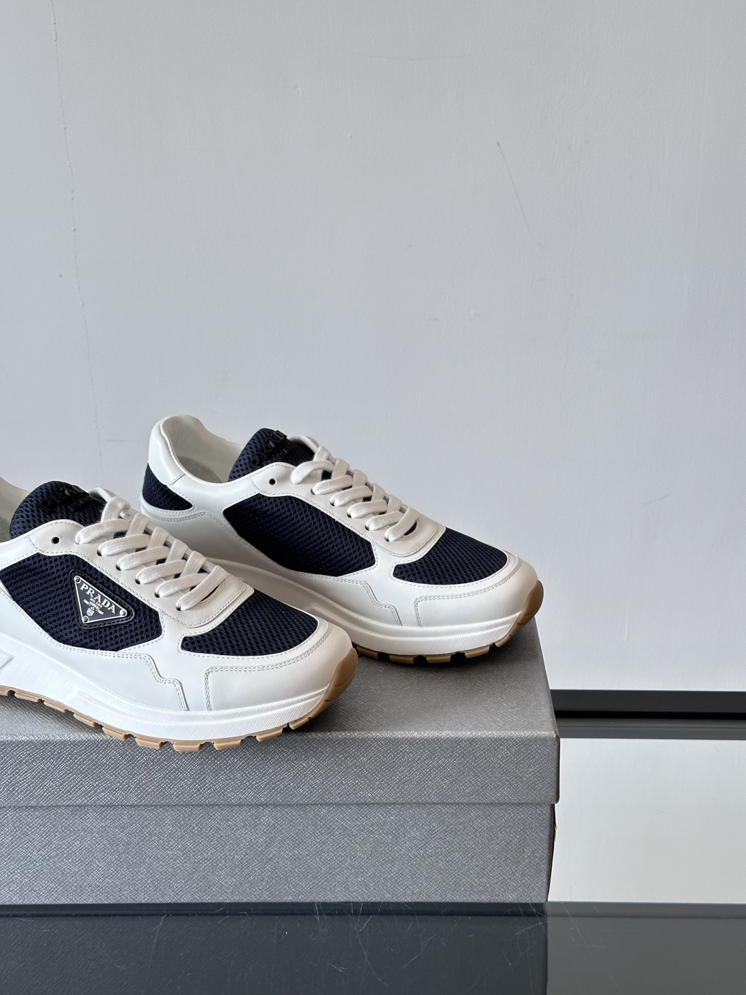 Prad*普拉达春夏新品男士高端运动鞋,这款运动鞋时尚百搭,简洁现代,融合运动风格和精致细节。选用进口牛皮材料拼接透气网面🕸️打造,搭配橡胶鞋底,鞋舌压印字母徽标,简约时尚单品。
