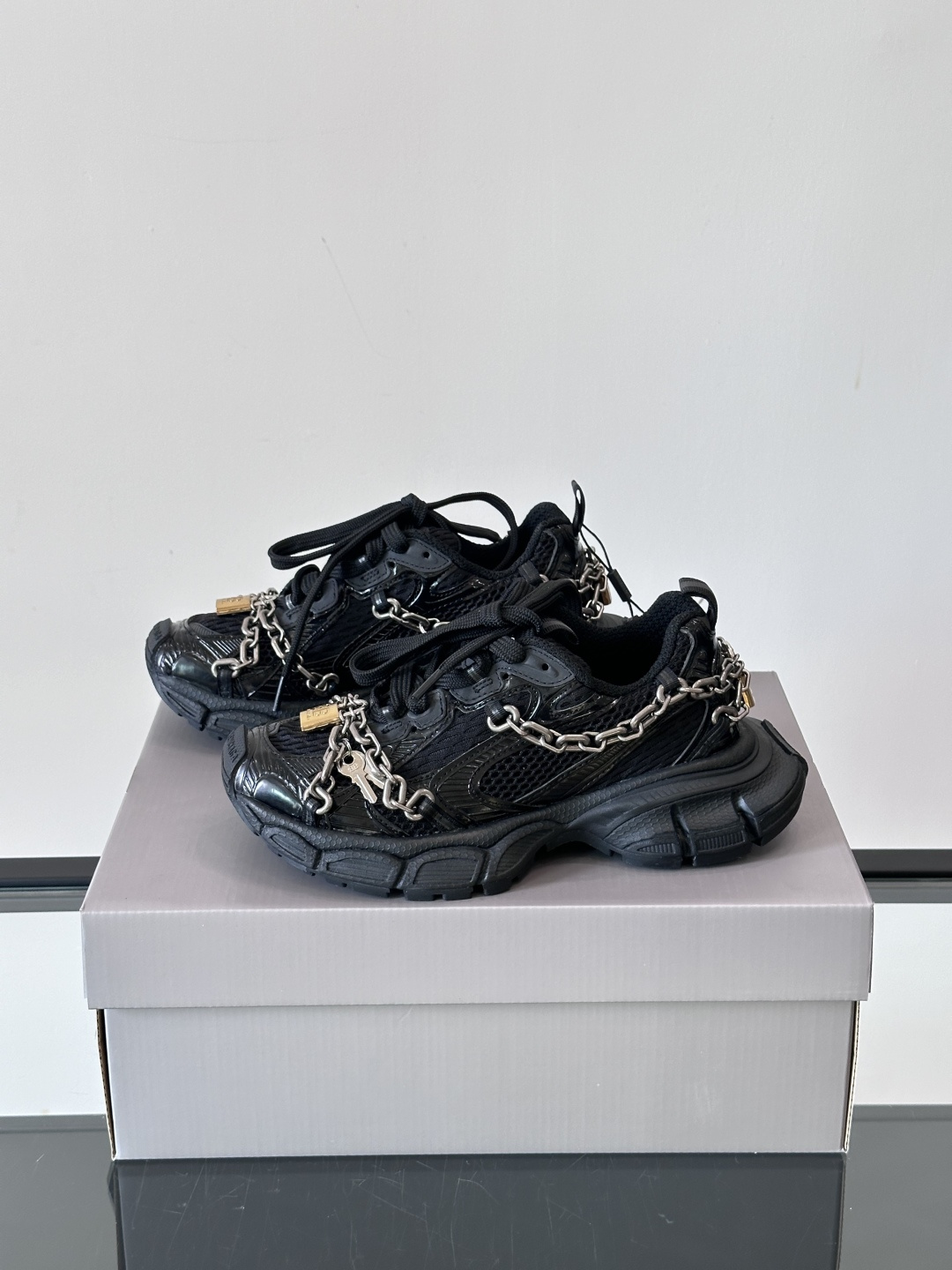 Balenciaga巴黎世家3XL全黑锁链🔒。颠覆想象,重塑经典当复古风潮与未来美学碰撞,Balenciaga巴黎世家16代MONDAY黑色老爹鞋以前卫设计与极致工艺再次引爆潮流圈!鞋身采用**头层牛皮材质**,触感细腻柔韧,搭配夸张的体积轮廓与反光细节,打造出极具辨识度的先锋造型。多层组合橡胶大底不仅防滑耐磨,更以立体层次感强化视觉冲击力,每一步都彰显不羁态度。