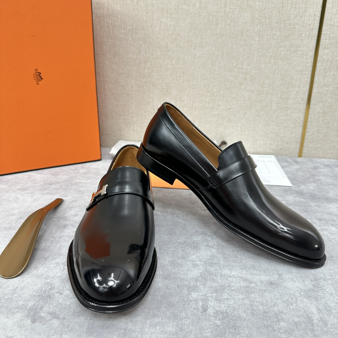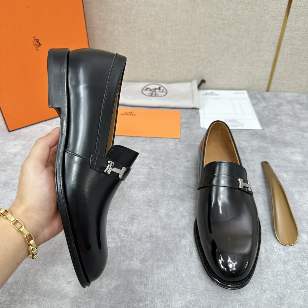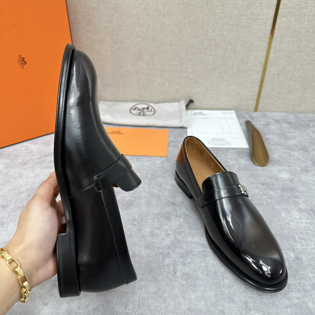 💋💍H家新品 Herme* 爱马-仕 julio乐福鞋皮鞋 官方RM B 11.150 采用进口牛皮打造 鞋面横带饰🈶️镀钯Paris鞋扣 内里水染牛皮里 原版真皮大底复合橡胶底片 增强抓地性能 立体凹凸感logo尽显奢华品质 精致做工 打造悠闲典雅风范 一脚蹬穿着 经典隽永的优雅设计 彰显时尚前卫风格。 标准皮鞋码数:39~44# (38.45.46# 🉑️定做).