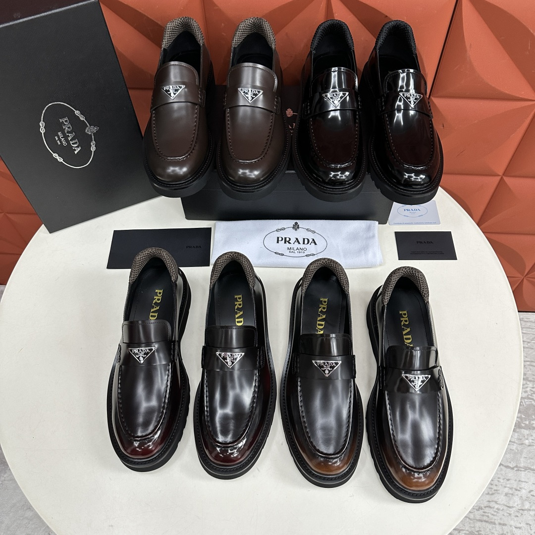 💋💍P家 普-拉-达 升级版男士亮面乐福鞋轻质厚底皮鞋 一脚蹬新款!采用进口亮面开边珠擦色牛皮打造 新颖廓型与精致细节,设计风格焕然一新 三角形徽标装饰,沿条结构 配锯齿状轻质橡胶鞋底 舒适度升级 双层沿条 沿条周圈车线 超轻套脚款 懒人专属🉑️休闲🉑️正装搭配。标准皮鞋码数:39~44 (38.45🉑定做)批520.