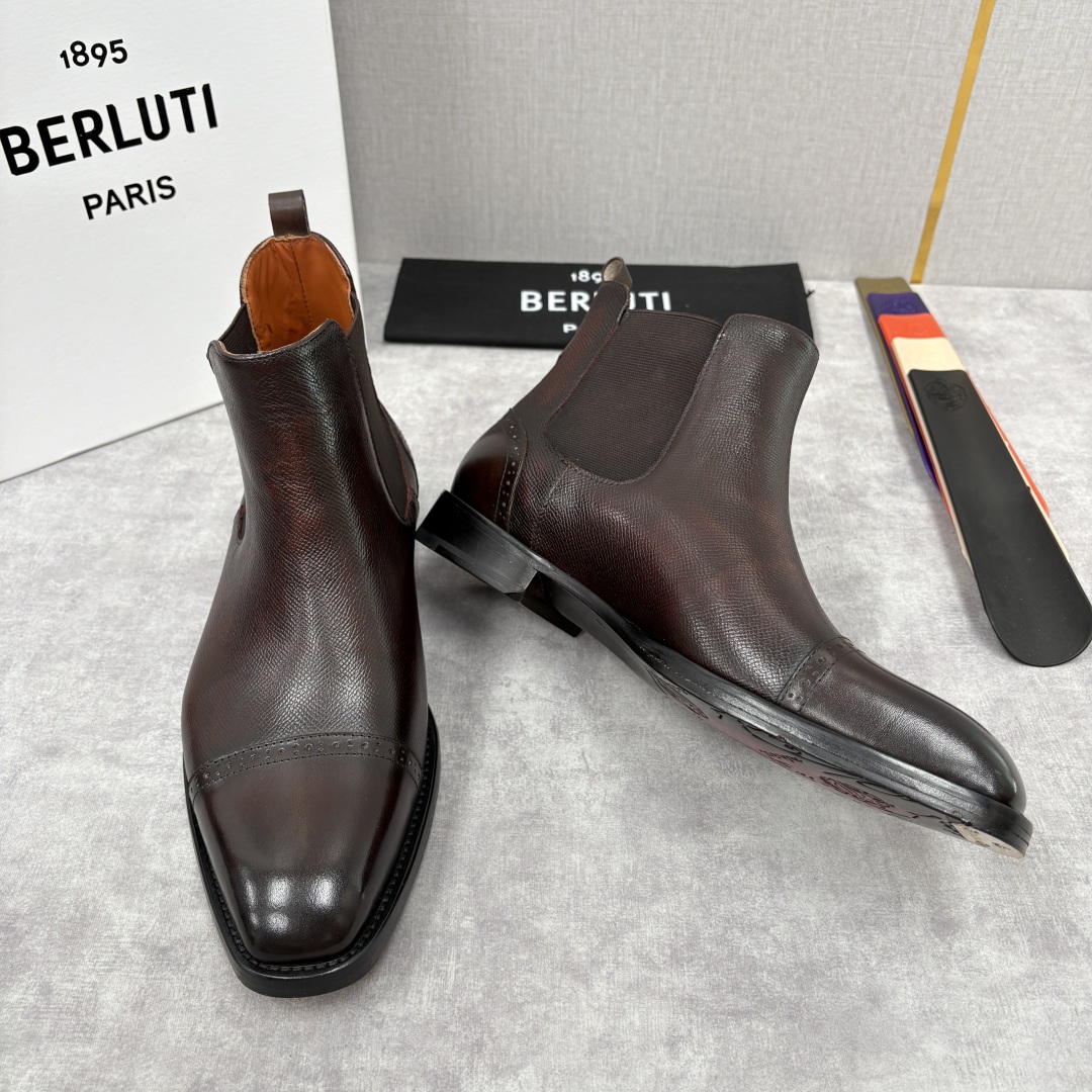 💋💍Berlut* 布鲁提 新品男士靴子 切尔西皮靴 以精湛工艺诠释奢华鞋履美学 这款靴子采用进口头层牛皮/高丝光磨砂牛皮拼接制成 双侧饰以弹力松紧带 后跟饰以牛皮提鞋环 水染小牛皮内里 垫脚处内底有泡棉,更为舒适。原版意大利真皮大底 前置铜头金属贴片 后跟置入橡胶贴片 加强减震功能 皮革款光泽细腻,触感温润;磨砂皮款质感柔软,自带复古腔调。经典切尔西靴型,松紧带设计方便穿脱,同时贴合脚踝,兼具舒适与利落感。鞋头与鞋跟处的细节处理,彰显品牌对工艺的极致追求,无论是搭配西装打造商务精英范儿,还是与休闲装组合营造随性格调,都能轻松驾驭,为整体造型增添高级质感,是鞋履收藏与日常穿搭的绝佳之选。 配原包装发售!
