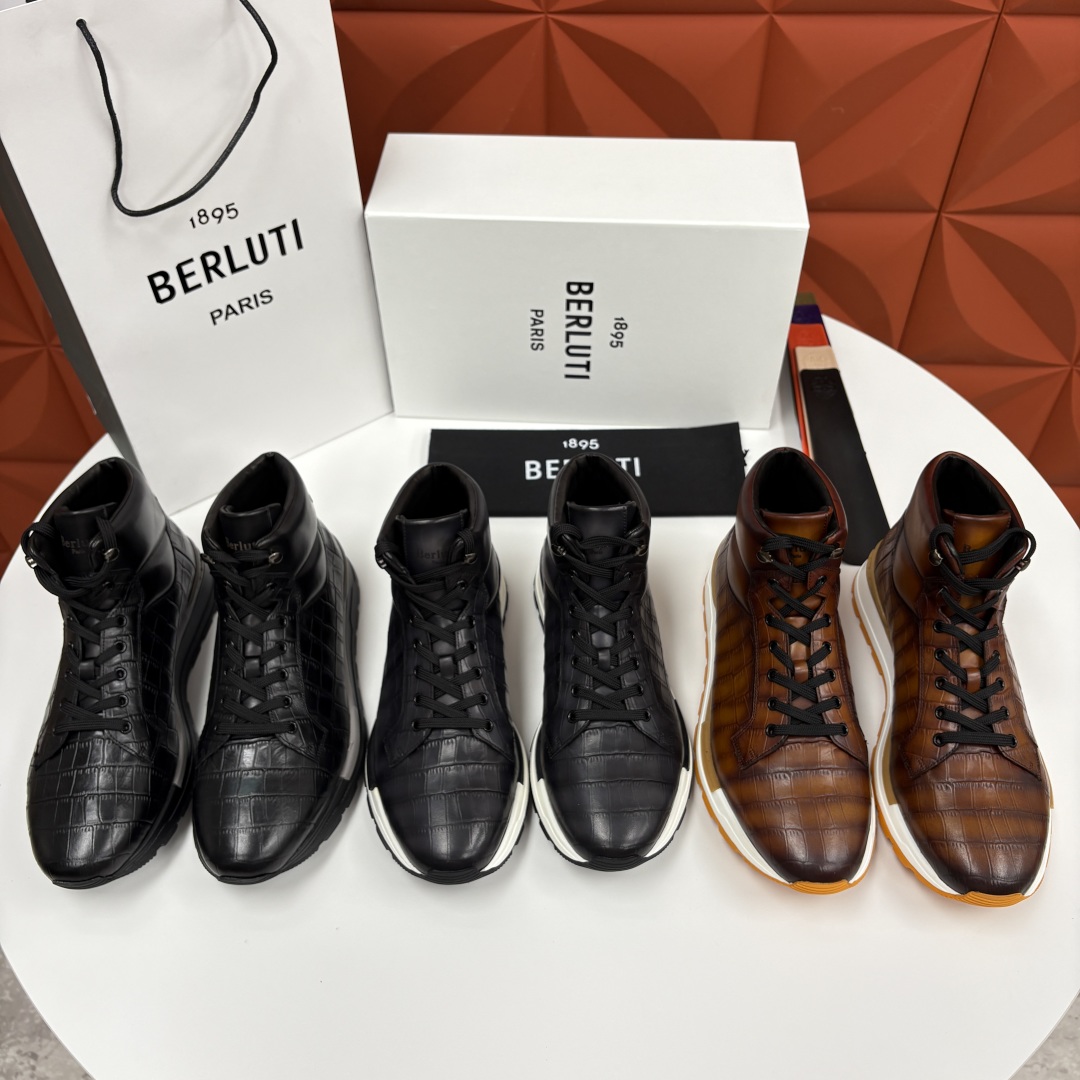 💋💍Berlut* 布鲁提 升级版第四代私模大底 Fast Track皮革高帮运动鞋 鞋面采用头层压纹皮胚手工转色制成,呈现出独特的仿鳄鱼皮纹理,质感细腻且富有高级感。鞋带、鞋帮等细节处,做工精细。鞋帮的拼接设计,让整体造型更具立体层次,彰显品牌对细节的严苛把控。 无论是经典黑灰色,还是独具韵味的棕色调,都在纹理的加持下,展现出别样的时尚魅力。 小牛皮衬里和黑色内底 , 双层小牛皮垫脚制作,鞋垫高弹欧索莱整体压制,全新开模大底 TPU底片组合发泡大底,模具的细腻度要求非常高,合模分割线调整,最终才能生产正品质感的鞋底!鞋底设计兼顾舒适与支撑,行走时能有效缓冲压力,为双脚带来轻松感受。无论是搭配休闲装打造街头潮流感,还是与正装组合呈现雅痞风格,Berlut* 这系列高帮鞋都能成为造型亮点,助力你展现独特品味,诠释奢华时尚生活方式 。