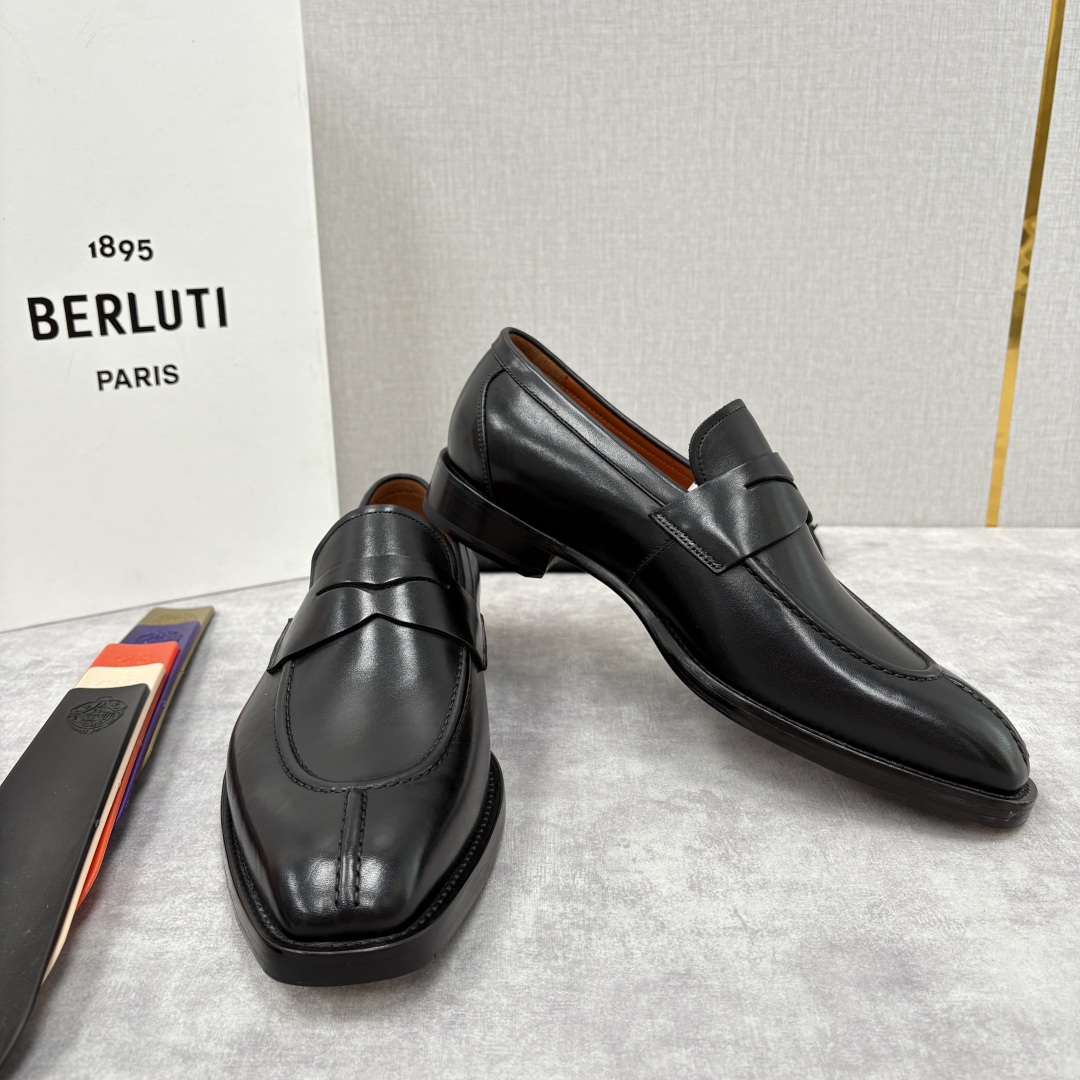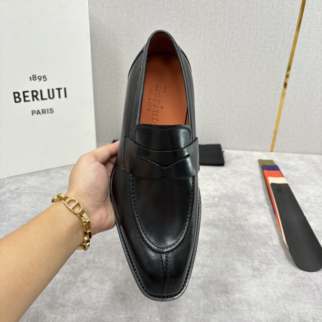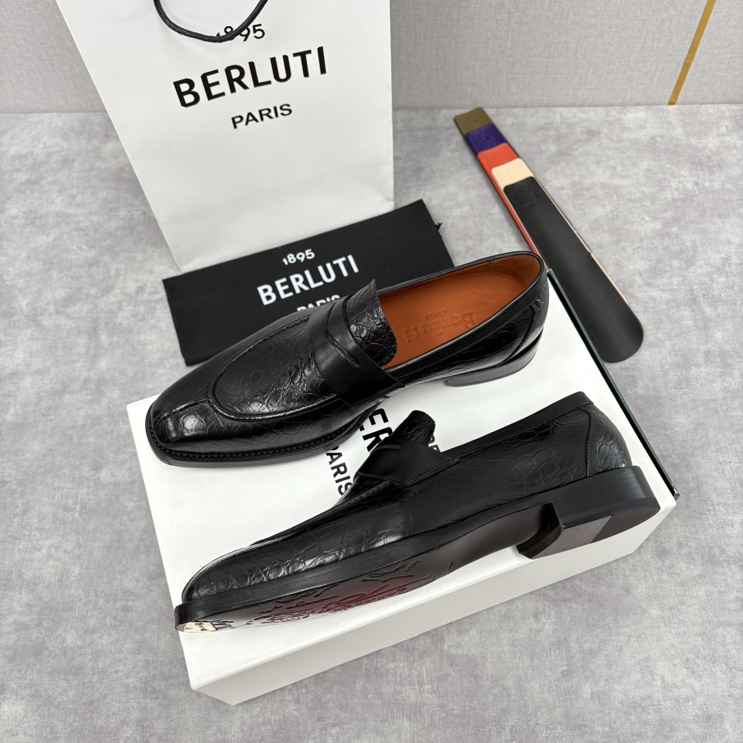 💋💍BERLUT* 布鲁提 新品男士乐福鞋皮鞋 这款 Berlut*乐福鞋采用了经典的一脚蹬款式,简约流畅的线条勾勒出优雅的鞋身轮廓,彰显着低调而奢华的气质。意大利进口/鳄鱼纹压纹牛皮/平纹小牛皮 手工改色擦色而成 鞋面选用顶级的小牛皮材质,皮质细腻柔软,富有光泽,且具备良好的柔韧性与耐用性。随着穿着时间的增加,皮革会逐渐形成独特的光泽和纹理,展现出独一无二的个性魅力 内里水染小牛皮 皮质细腻光泽透亮 简约套脚楦型 手工滚边收线缝接 细节精致 搭配意大利真皮大底底层饰以不对称 Scritto图纹徽标 鞋底边缘还镶有金属部件,不仅起到了装饰作用,还增强了鞋底的耐磨性和耐用性,体现了品牌对细节和品质的极致追求。后跟橡胶贴片减震 有效保障上脚舒适度 。标志性的剪裁与版型,不仅贴合脚部曲线,提供舒适的穿着体验,更能瞬间提升整体造型的精致感,无论是搭配正式的西装套装出席商务场合,还是与休闲裤装组合展现日常的随性优雅,都能轻松驾驭,尽显绅士风度。