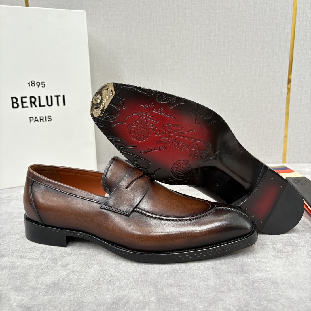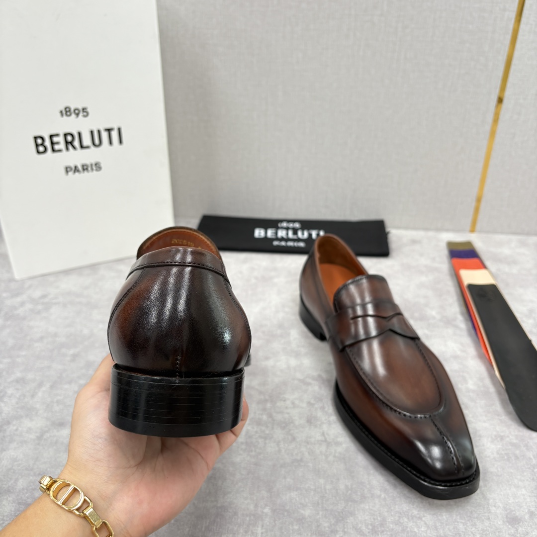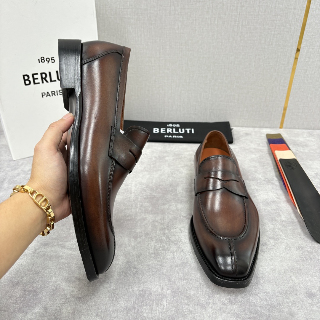 💋💍BERLUT* 布鲁提 新品男士乐福鞋皮鞋 这款 Berlut*乐福鞋采用了经典的一脚蹬款式,简约流畅的线条勾勒出优雅的鞋身轮廓,彰显着低调而奢华的气质。意大利进口/鳄鱼纹压纹牛皮/平纹小牛皮 手工改色擦色而成 鞋面选用顶级的小牛皮材质,皮质细腻柔软,富有光泽,且具备良好的柔韧性与耐用性。随着穿着时间的增加,皮革会逐渐形成独特的光泽和纹理,展现出独一无二的个性魅力 内里水染小牛皮 皮质细腻光泽透亮 简约套脚楦型 手工滚边收线缝接 细节精致 搭配意大利真皮大底底层饰以不对称 Scritto图纹徽标 鞋底边缘还镶有金属部件,不仅起到了装饰作用,还增强了鞋底的耐磨性和耐用性,体现了品牌对细节和品质的极致追求。后跟橡胶贴片减震 有效保障上脚舒适度 。标志性的剪裁与版型,不仅贴合脚部曲线,提供舒适的穿着体验,更能瞬间提升整体造型的精致感,无论是搭配正式的西装套装出席商务场合,还是与休闲裤装组合展现日常的随性优雅,都能轻松驾驭,尽显绅士风度。