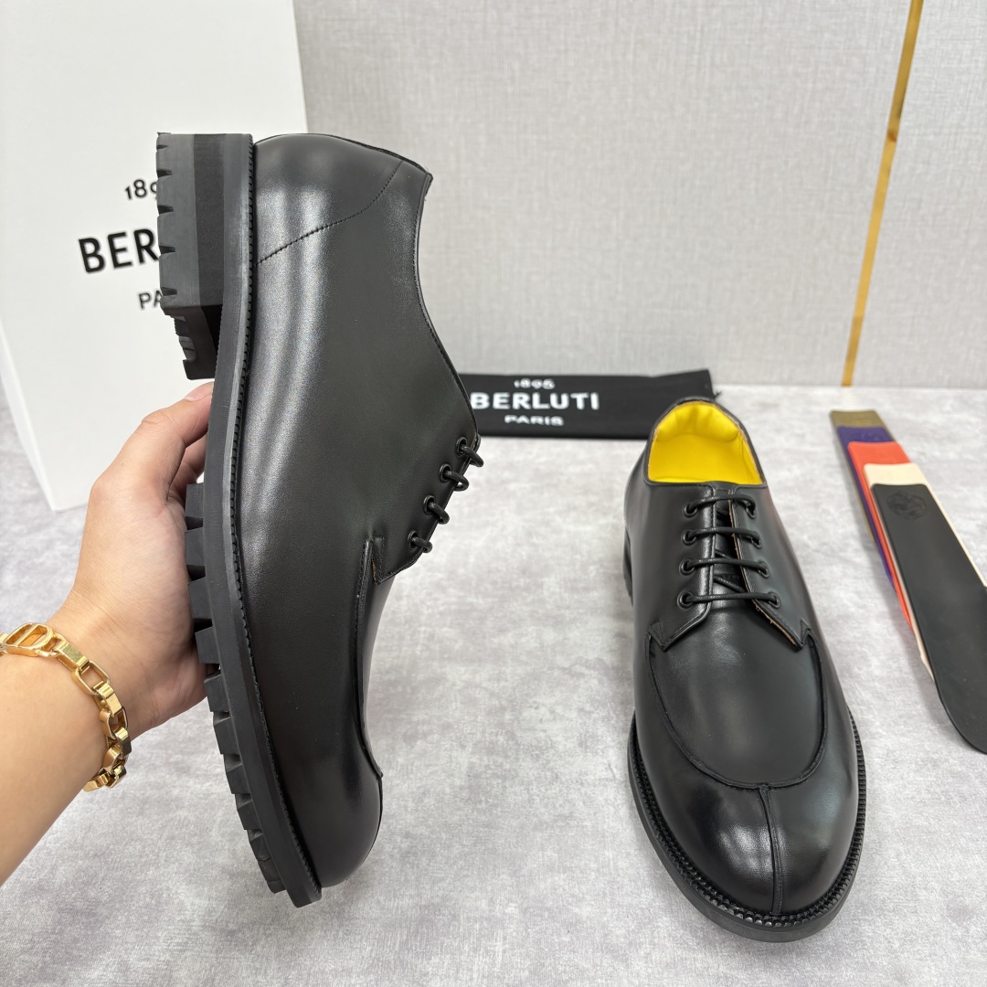 💋💍Berlut* 布鲁提 新品上架 New Oslo 皮革德比鞋 官方 22,600 这款系带皮鞋选用优质头层皮胚手工转色制成,经 Berlut* 传承的手工技艺雕琢。细腻纹理、温润触感,彰显高级质感。手工擦色改色工艺是亮点,深浅渐变间,每双鞋都拥有独一无二的色泽层次,如同时光沉淀的痕迹,在经典中注入专属个性,告别千篇一律的沉闷。鞋内明黄色小牛皮衬里,不仅以明亮色彩打破单调,更采用柔软亲肤材质,贴合双脚,行走时给予温柔包裹。现代高科技波浪形外底与防水可翻新鞋底提供抓地力与稳定性,轻松应对多元环境。扎实鞋底兼顾稳定性与缓震性,让你在彰显格调的同时,也能享受自在行走的轻松,将优雅与实用完美融合。 传承正装皮鞋的经典系带设计,简约鞋型自带绅士基因。无论是商务会晤时搭配西装,展现专业沉稳;还是休闲场合与牛仔、大衣组合,碰撞出复古雅痞格调,都能精准融入,成为造型的“质感担当” ,让每一步都走出从容自信。