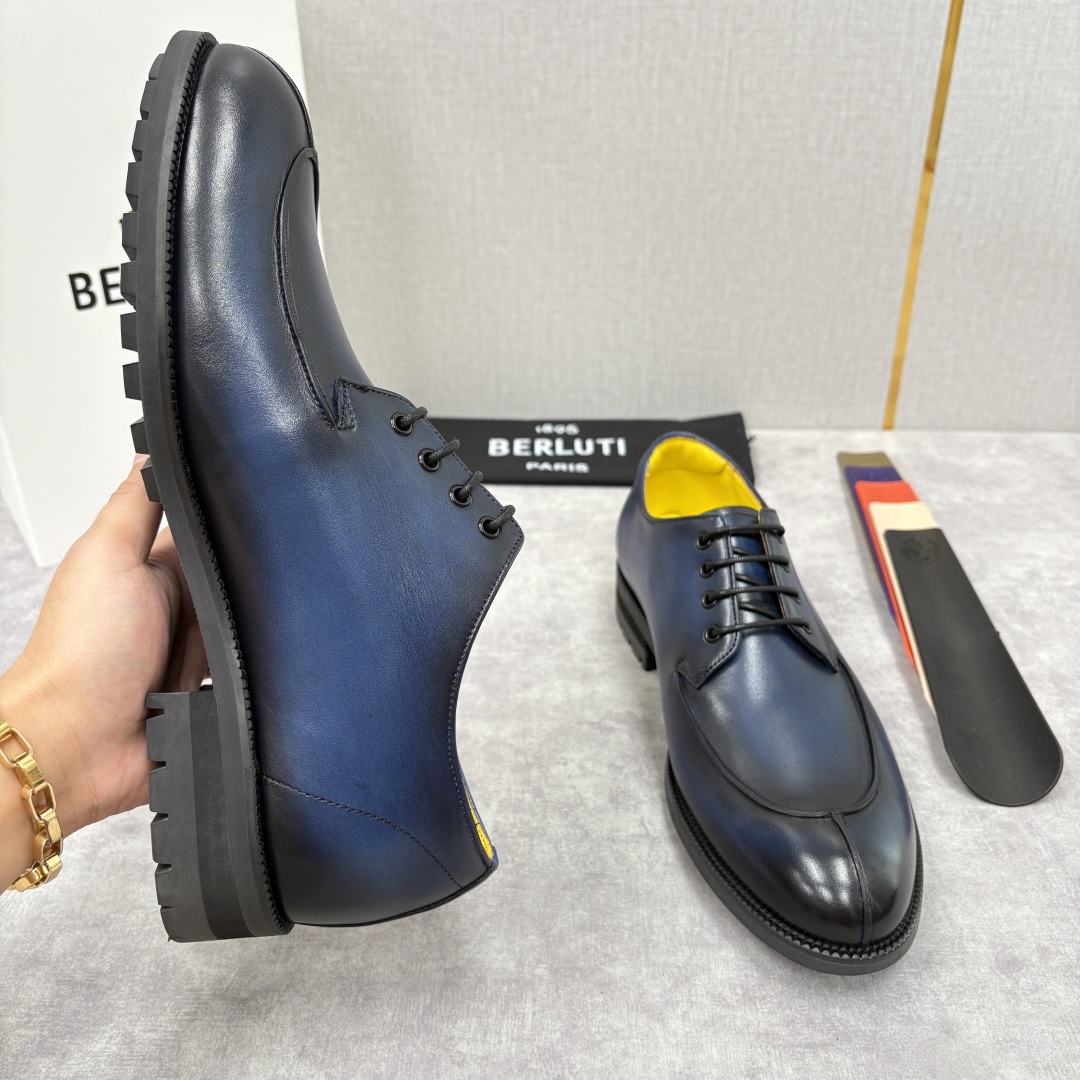 💋💍Berlut* 布鲁提 新品上架 New Oslo 皮革德比鞋 官方 22,600 这款系带皮鞋选用优质头层皮胚手工转色制成,经 Berlut* 传承的手工技艺雕琢。细腻纹理、温润触感,彰显高级质感。手工擦色改色工艺是亮点,深浅渐变间,每双鞋都拥有独一无二的色泽层次,如同时光沉淀的痕迹,在经典中注入专属个性,告别千篇一律的沉闷。鞋内明黄色小牛皮衬里,不仅以明亮色彩打破单调,更采用柔软亲肤材质,贴合双脚,行走时给予温柔包裹。现代高科技波浪形外底与防水可翻新鞋底提供抓地力与稳定性,轻松应对多元环境。扎实鞋底兼顾稳定性与缓震性,让你在彰显格调的同时,也能享受自在行走的轻松,将优雅与实用完美融合。 传承正装皮鞋的经典系带设计,简约鞋型自带绅士基因。无论是商务会晤时搭配西装,展现专业沉稳;还是休闲场合与牛仔、大衣组合,碰撞出复古雅痞格调,都能精准融入,成为造型的“质感担当” ,让每一步都走出从容自信。