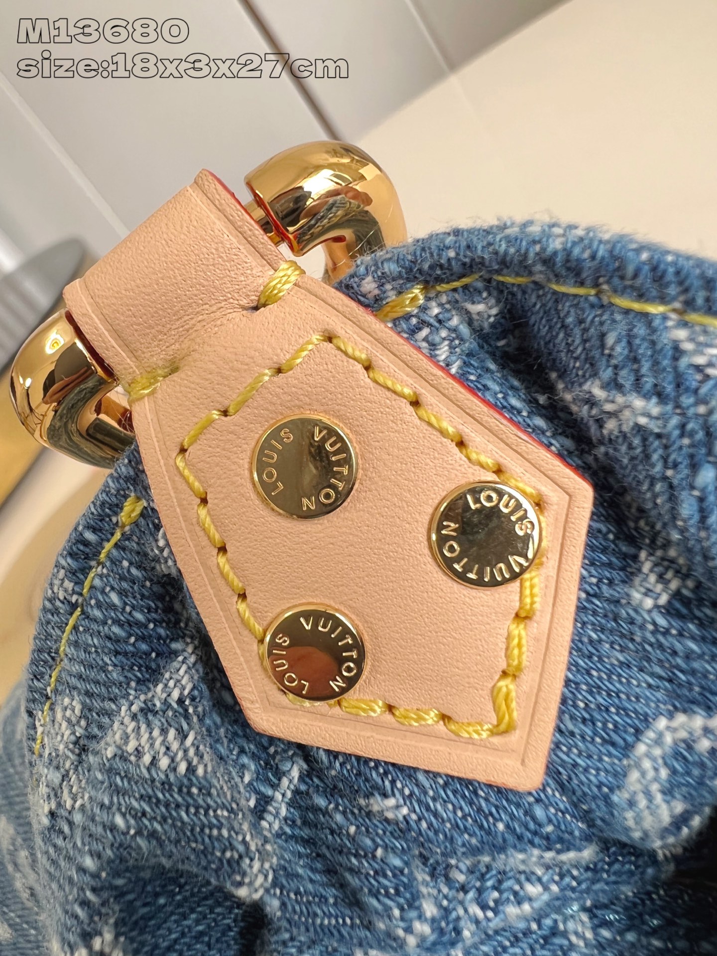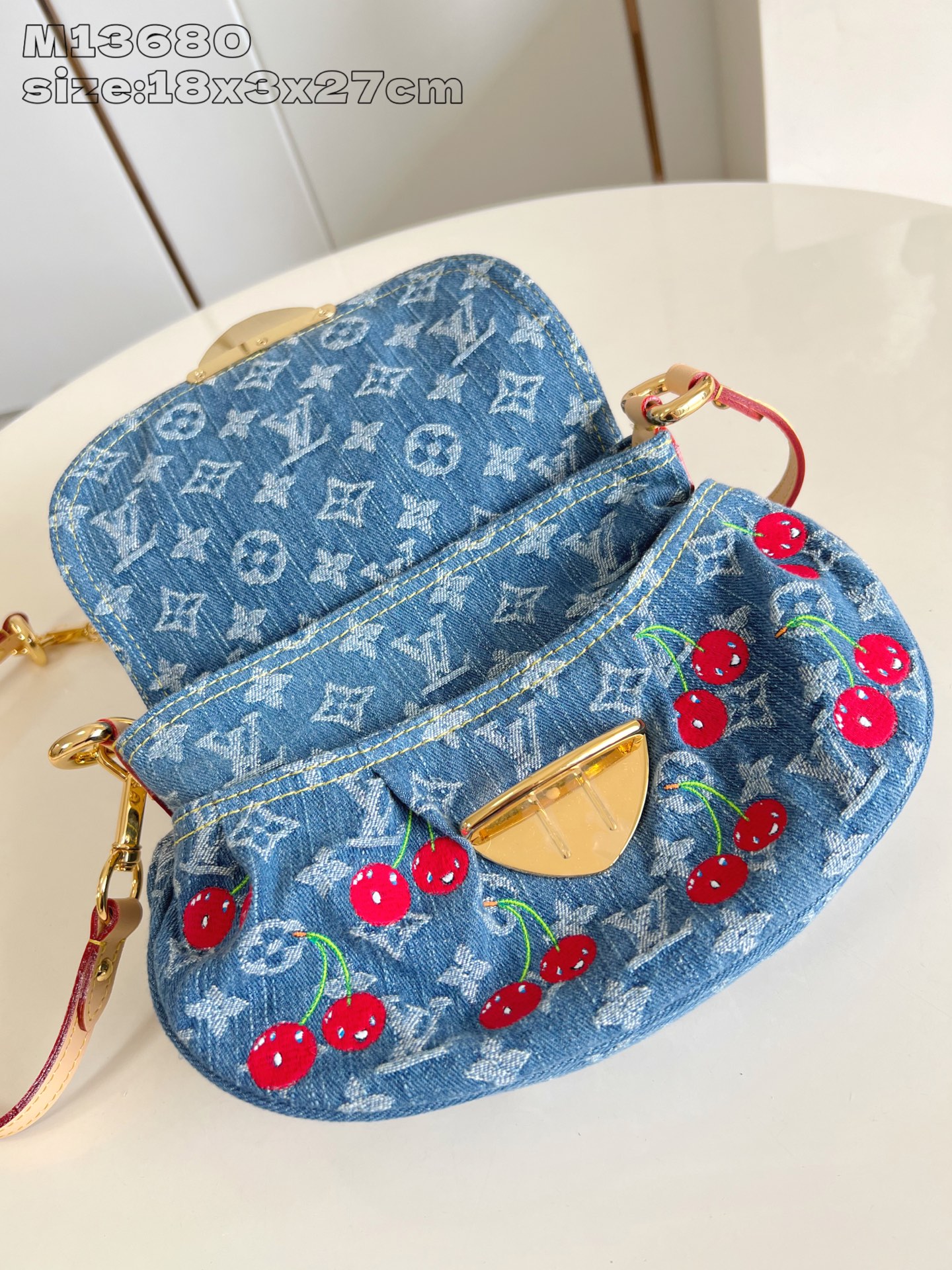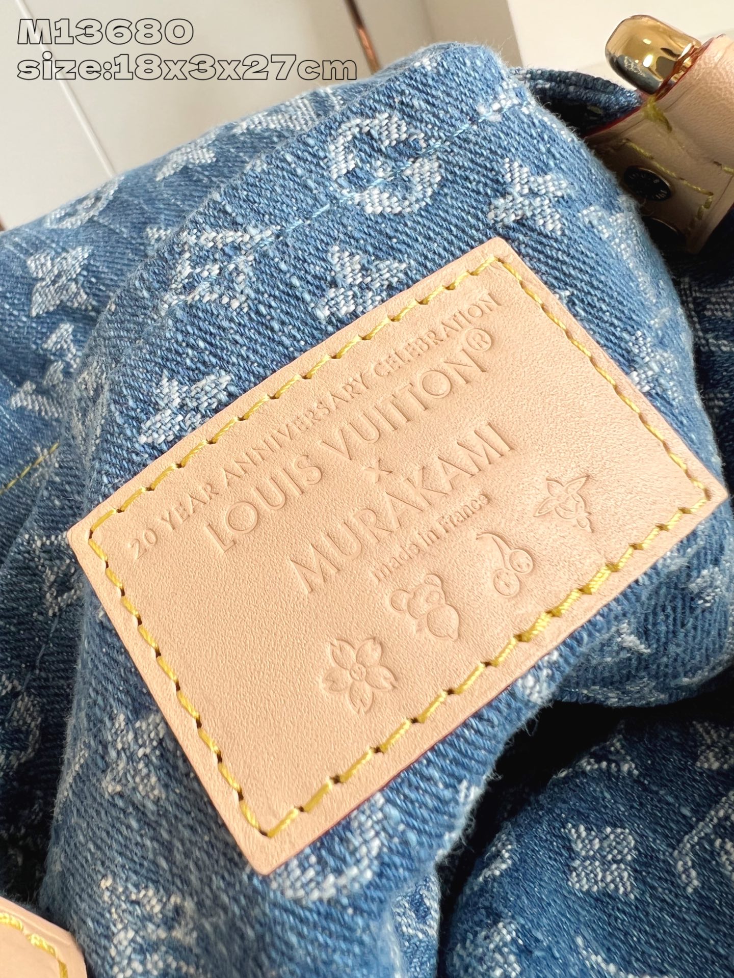 【顶级原单 M13680/对版】本款 Sunset 手袋取材 Monogram 丹宁布,以复古笔触塑造圆润构型,再借醒目插扣点亮设计。明丽樱桃刺绣彰显路易威登 x 村上隆复刻系列的灵动格调,饰钉皮革肩带完善整体。18 x 3 x 27 厘米 (高 x 宽 x 长度).