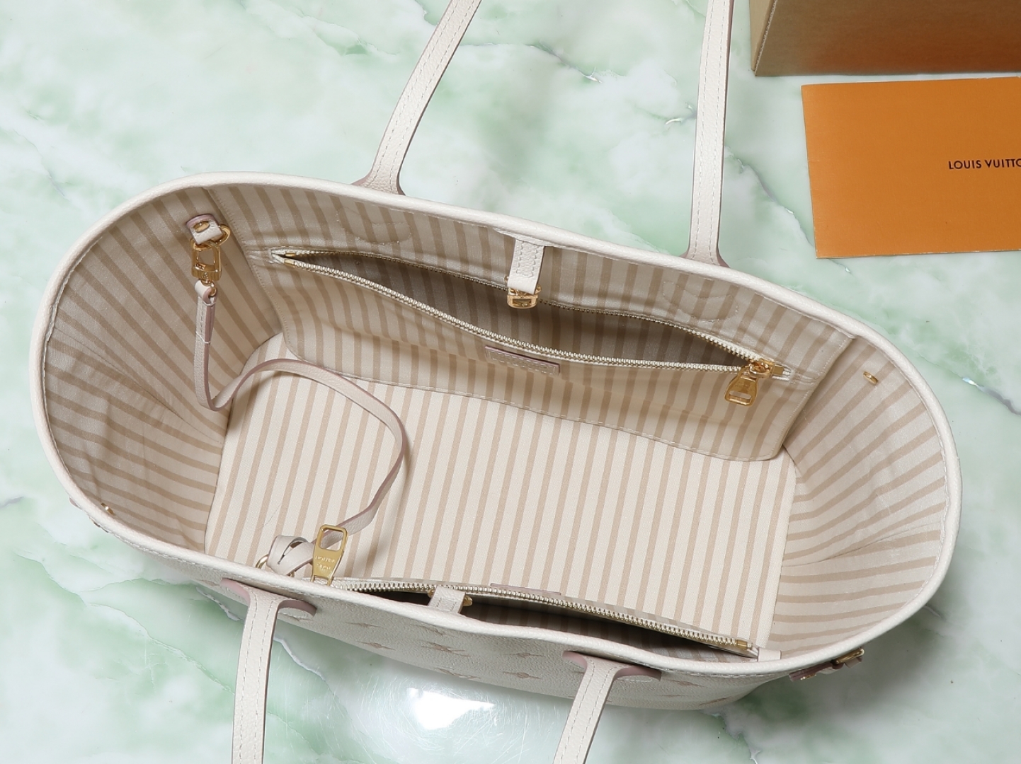 【顶级原单 独家实拍】M14285奶油色 全皮提花购物袋 Neverfull MM 中号手袋 M45685 这款Neverfull MM yx手袋以同色美学重译经典Monogram Empreinte 皮革。Neverfull是一个宽敞的包,带有侧边鞋带,可以收紧光滑的诱惑或放松休闲的外观。里面有一个可拆卸的袋子,用皮绳固定在袋子上。尺寸:32-29-17厘米。.
