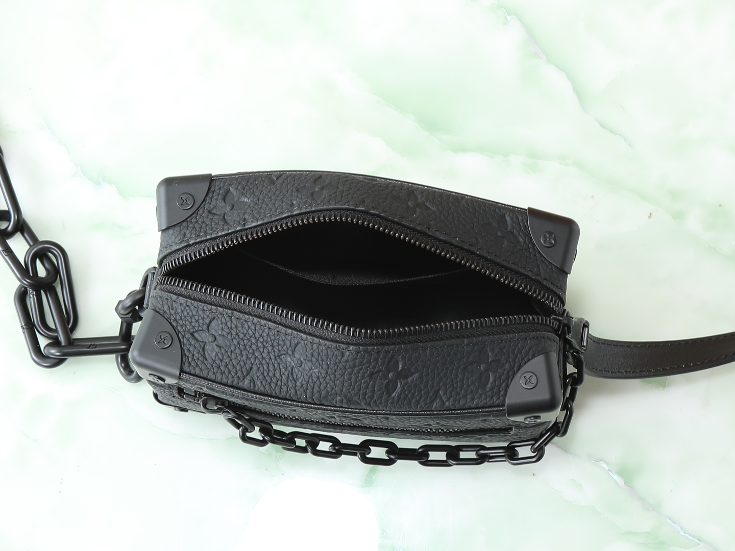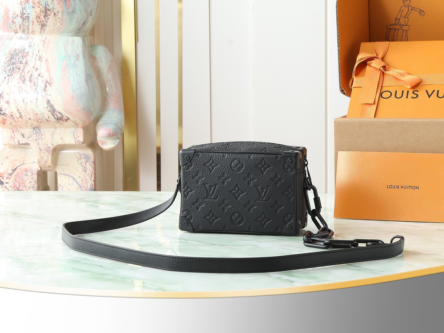 375434_640MINI SOFT TRUNK 手袋 标志性Monogram印花搭配对比色树脂链带 全皮压花彩链子小盒子造型精致 此款富有魅力的手袋 棱角分明而具优雅内涵 展现出对制箱传统的现代诠释树脂链带提供多种背携选择既可肩背也可手提。size 18.5x13x8cm.