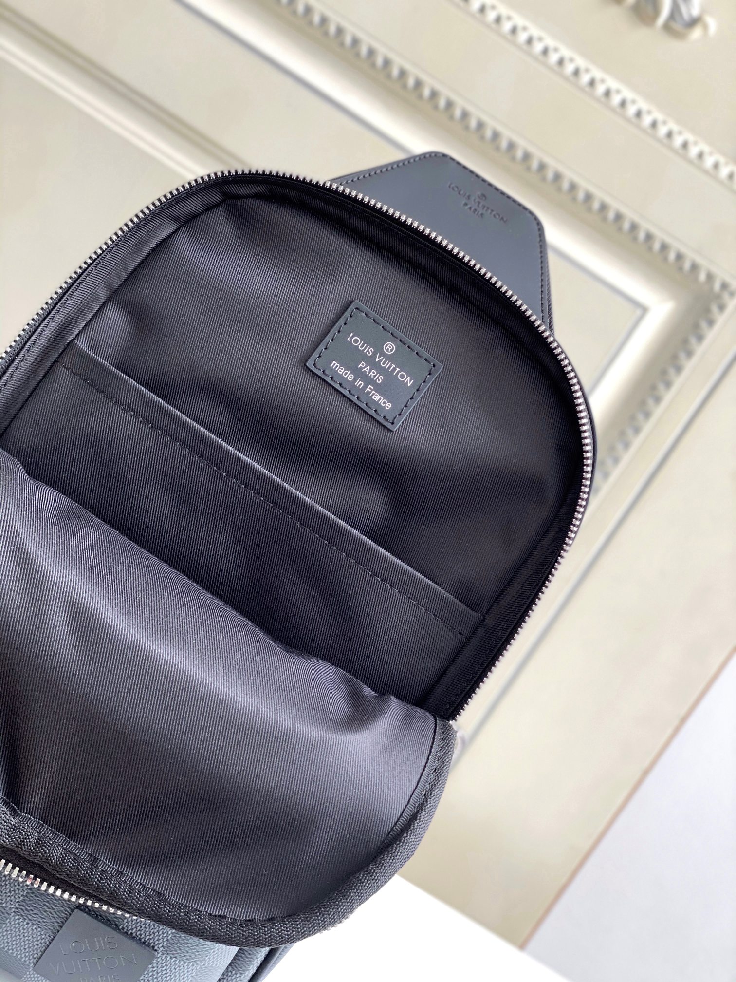 【海原外单 独实家拍45302黑格】本款 Avenue 单肩包取材 Damier Graphite 帆布,为正面外袋点缀路易威登巴黎标识皮革贴饰。可调节锦纶肩带可通过 D 形环固定于左右两侧,帆布肩带及内衬秉承可持续理念。Damier Graphite 涂层帆布一牛皮革饰边一织物内衬一正面方形金属件一主隔层一拉链前袋一顶部小号拉链袋一肩带不可拆卸,可调节!!;尺寸:20x31x7CM.