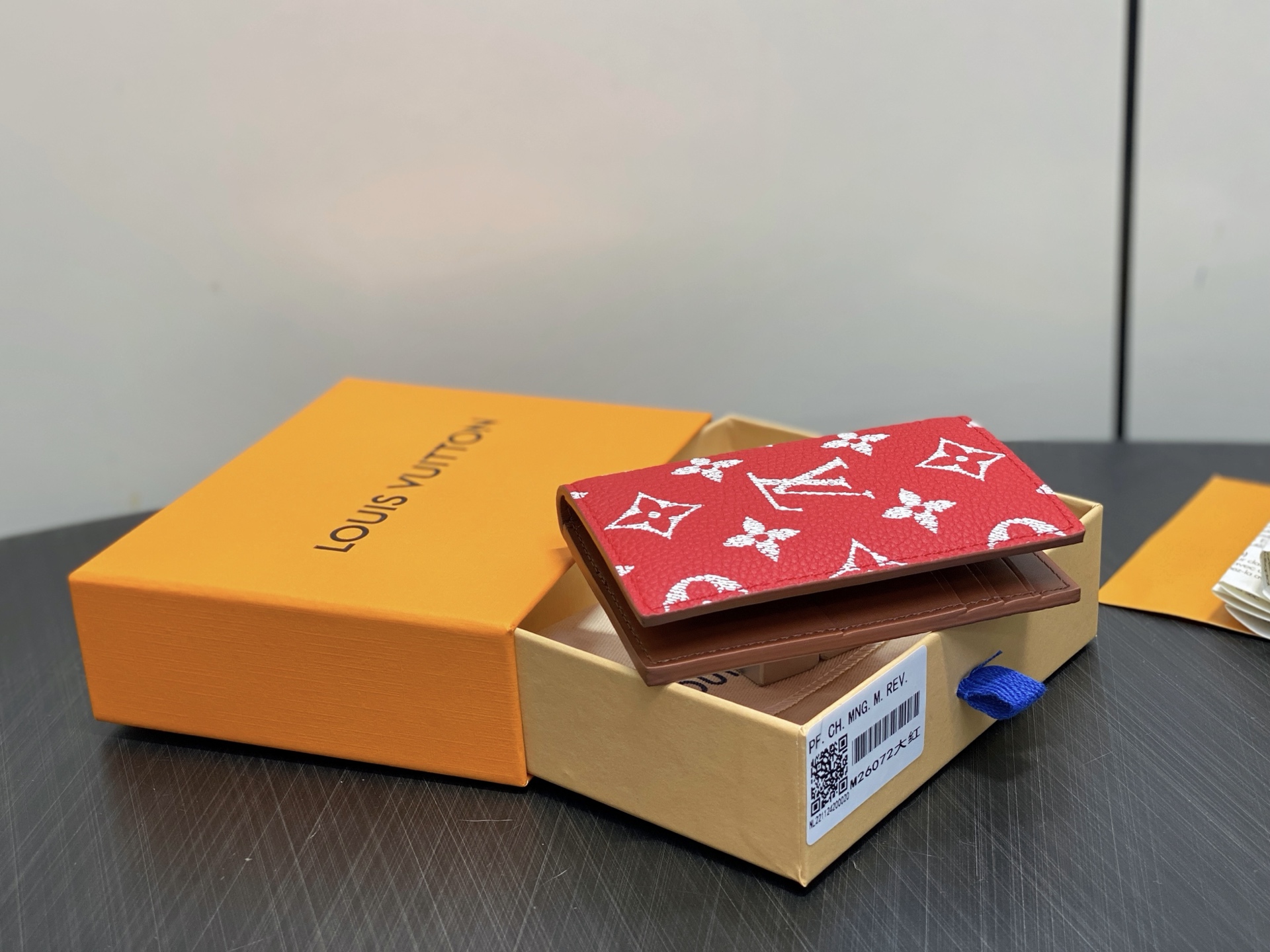【顶级原单】M26072红色 全皮丝印钱夹钱包 口袋钱夹 本款口袋钱夹为柔软粒面牛皮革包裹羊皮革内衬,以丝印 Monogram 图案呈现帆布印花的迷离观感,道出创意总监 Pharrell Williams 的新季巧思,为紧凑构型融入多重卡位和内外口袋,成就又一考究之选。11.1 x 1 x 7.5 厘米。.