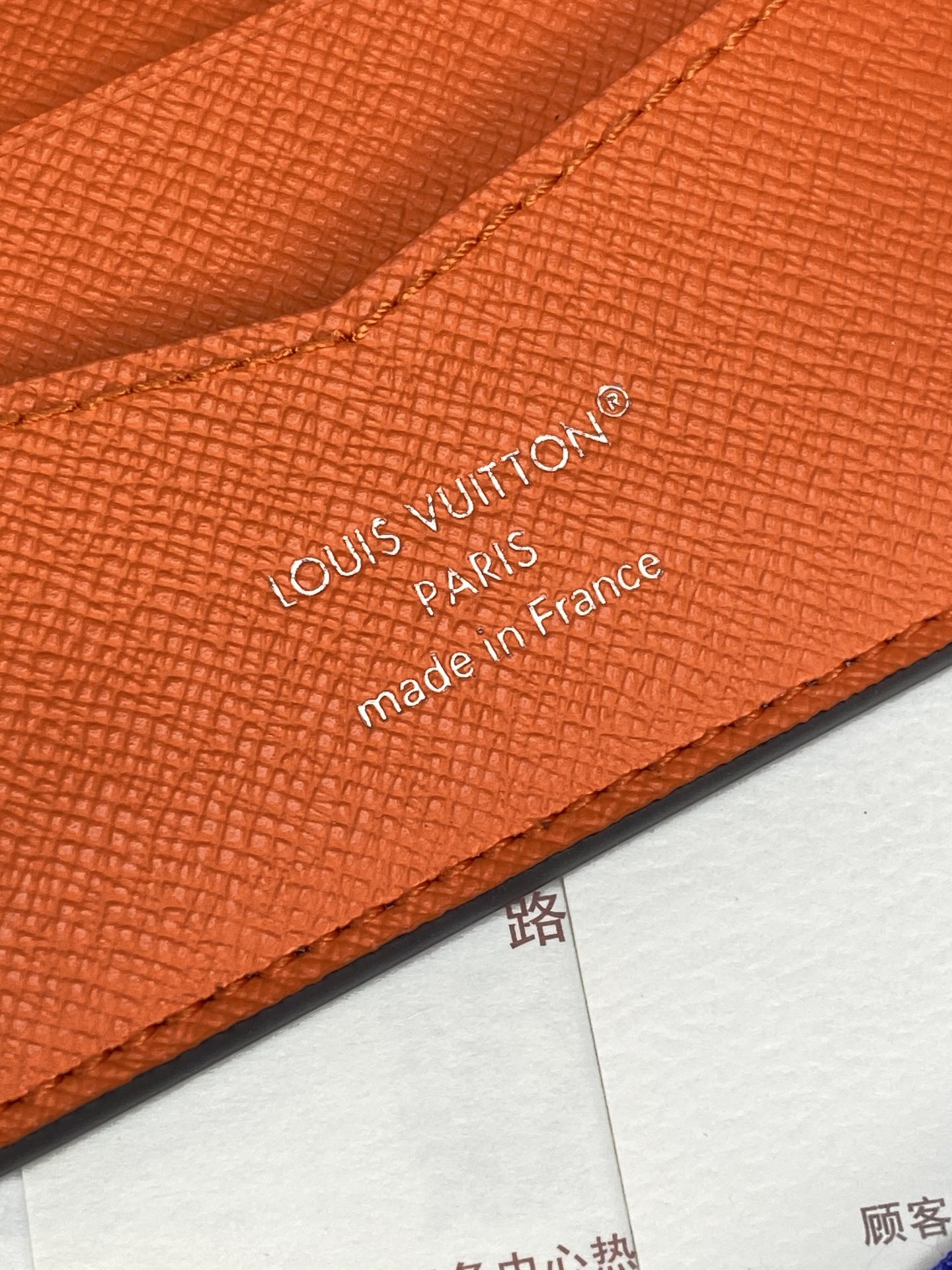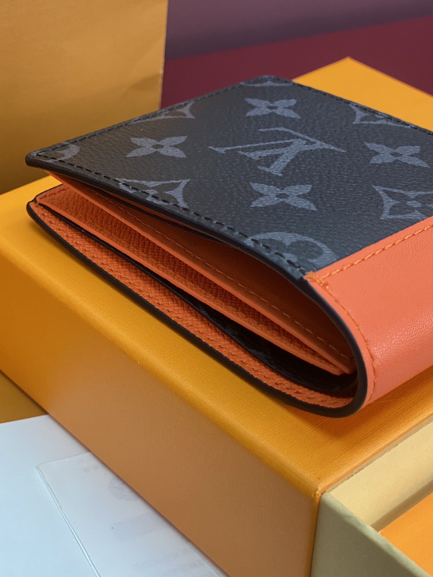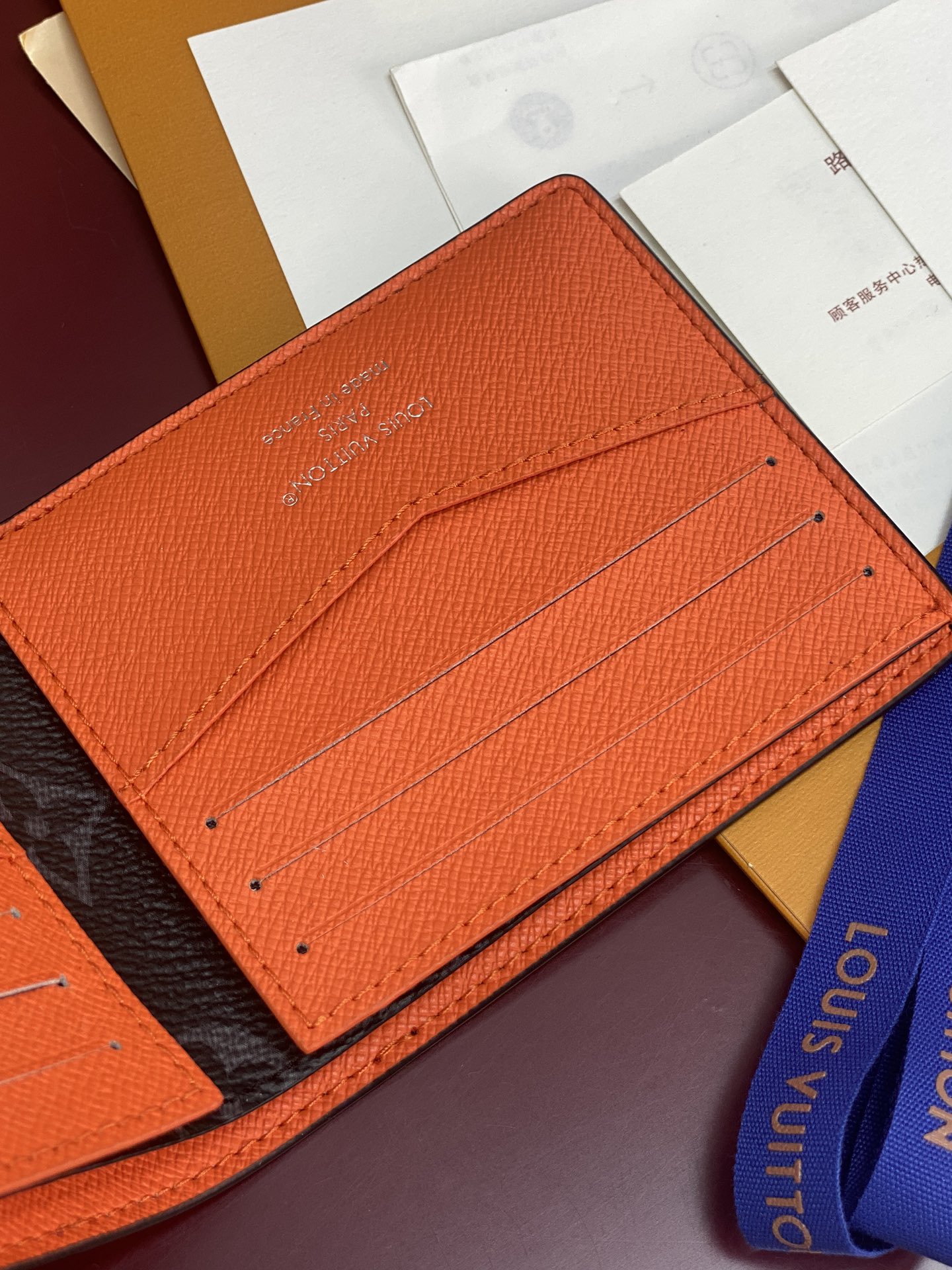 M25849 橙色!MUL TIPLE 此款钱夹Louis Vuitton HHI! 系列设计时尚低调、黑花配橙色皮短夹 便于收纳纸币、信用卡与收据,轻便耐用,可轻易放入上衣或裤装口袋。尺寸:12/9cm。.