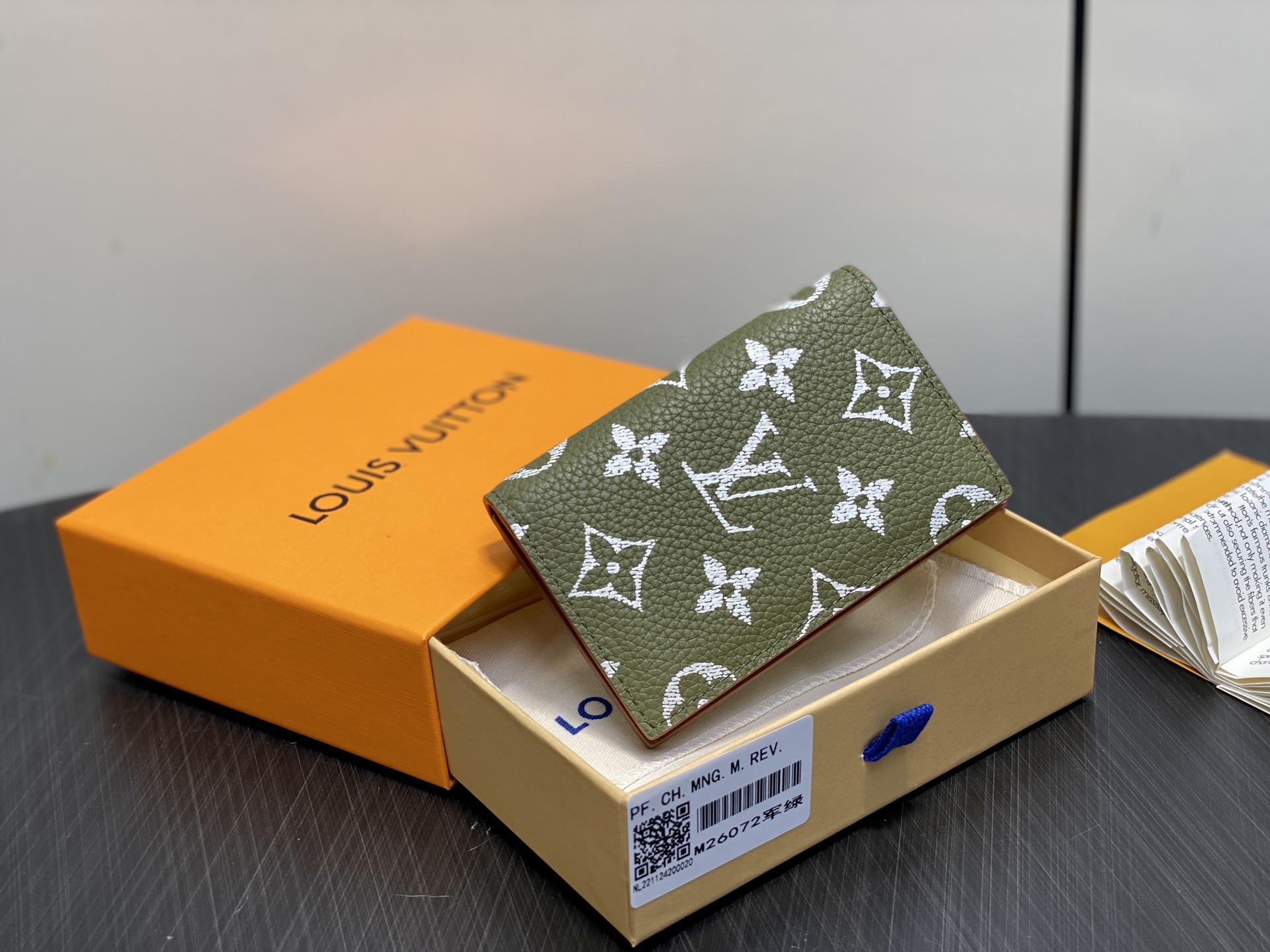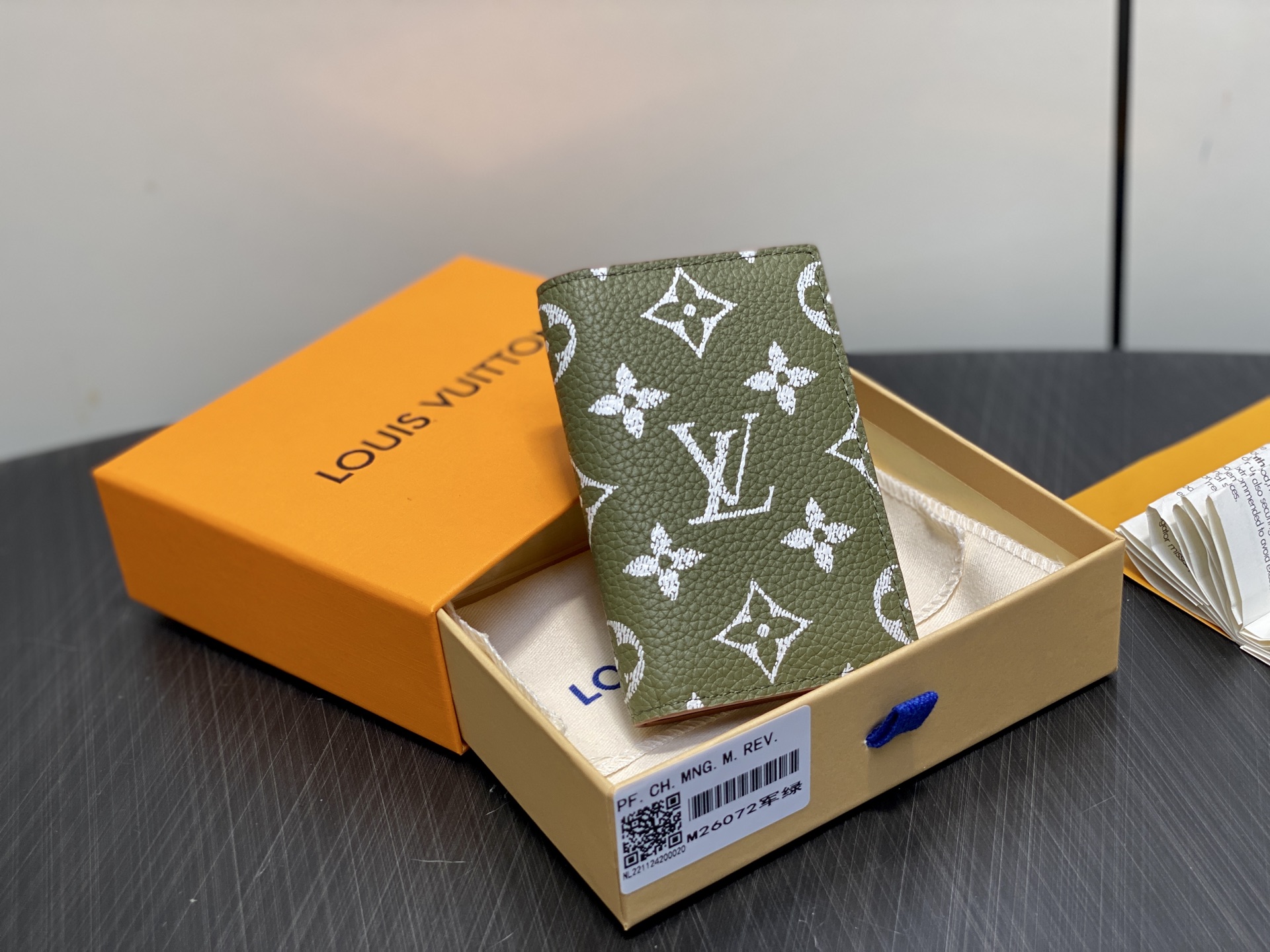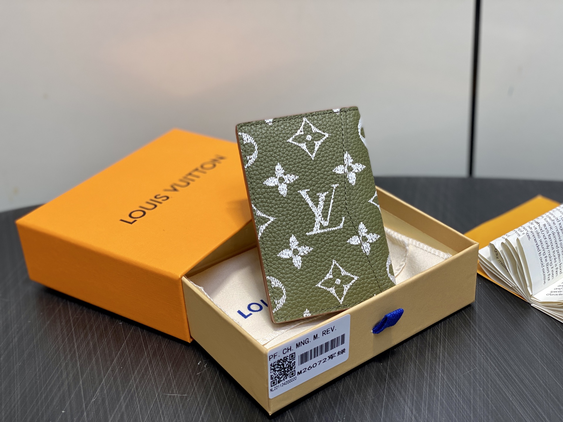 【顶级原单】M26072军绿 全皮丝印钱夹钱包 口袋钱夹 本款口袋钱夹为柔软粒面牛皮革包裹羊皮革内衬,以丝印 Monogram 图案呈现帆布印花的迷离观感,道出创意总监 Pharrell Williams 的新季巧思,为紧凑构型融入多重卡位和内外口袋,成就又一考究之选。11.1 x 1 x 7.5 厘米。.