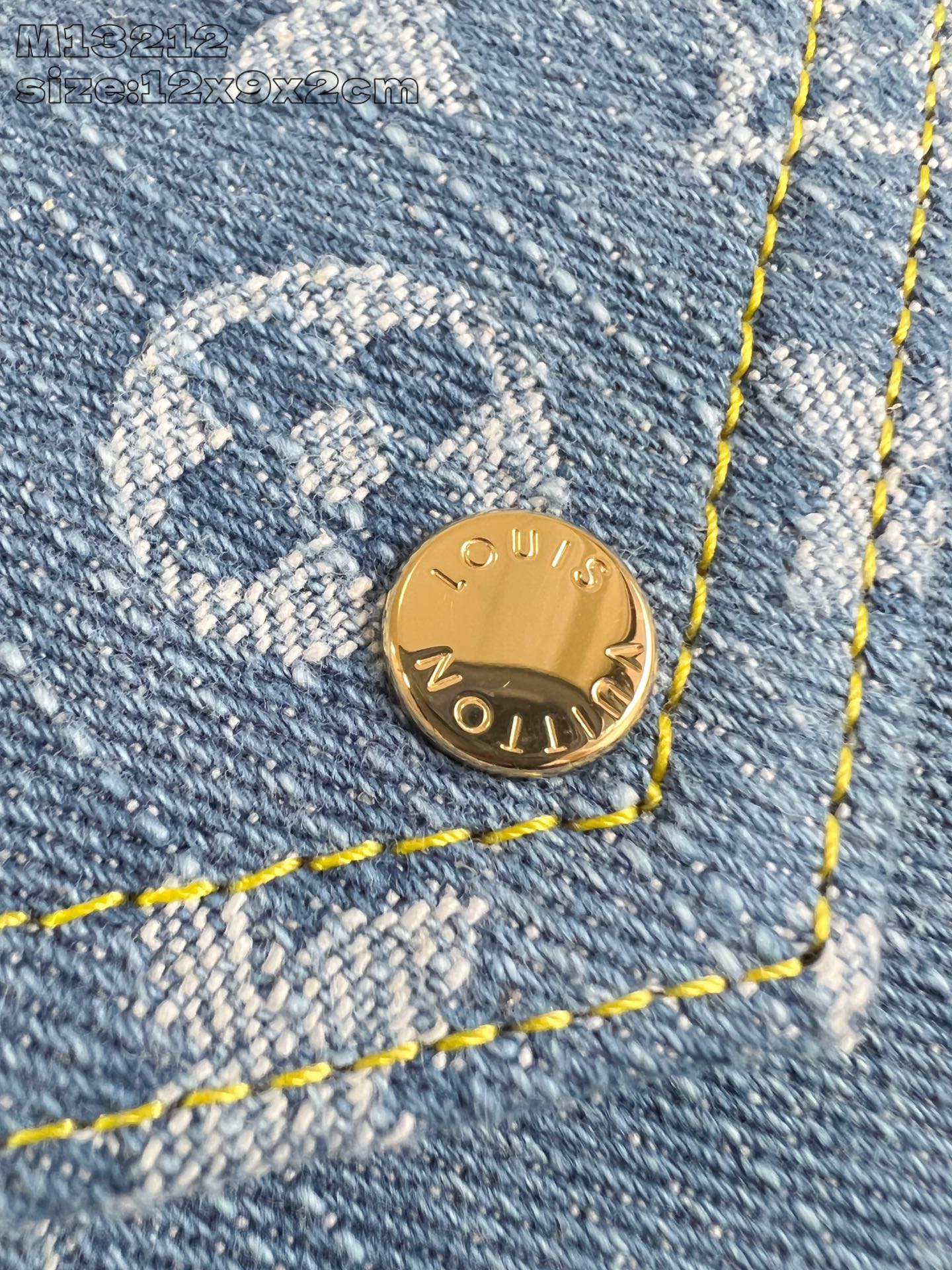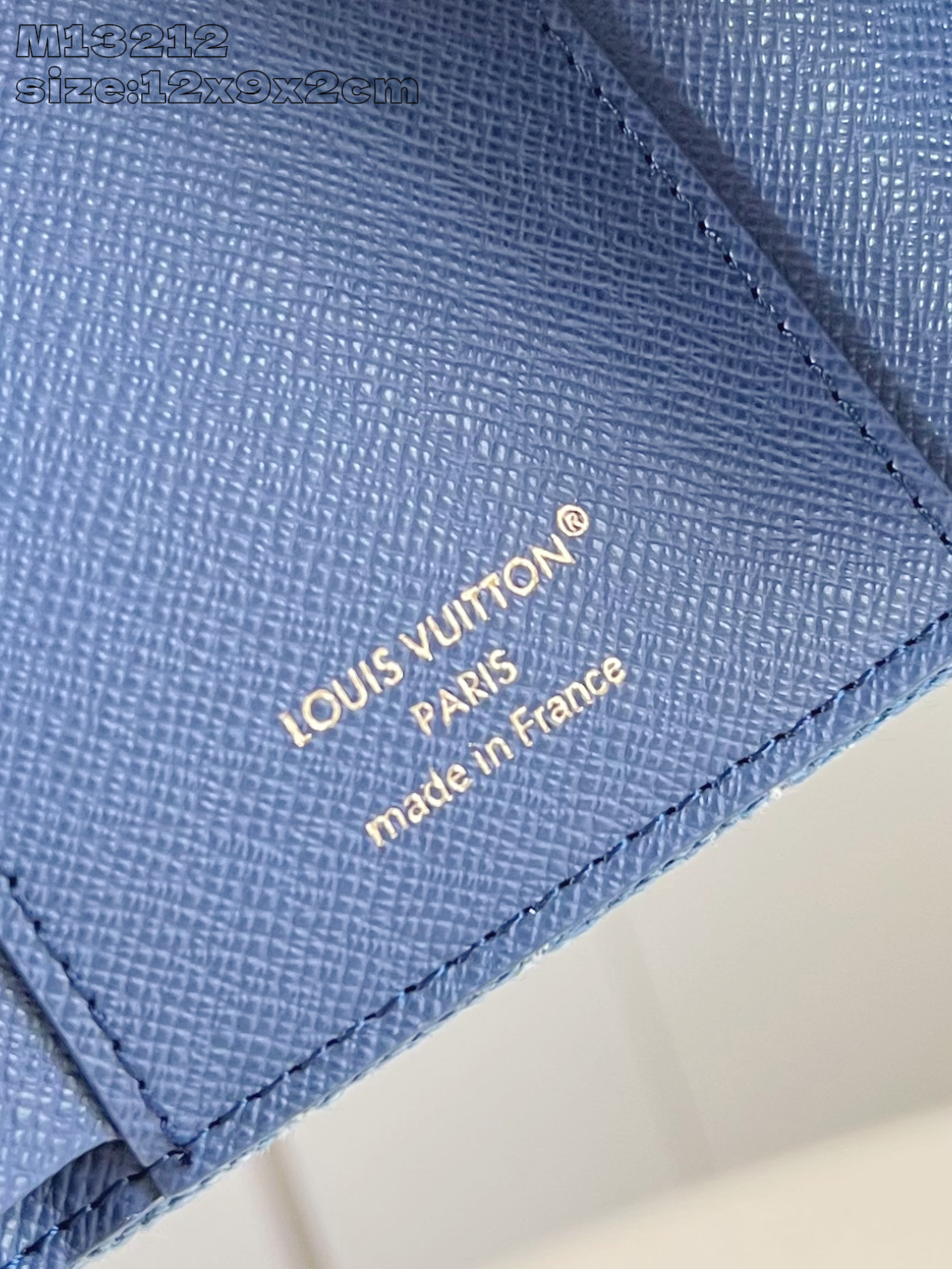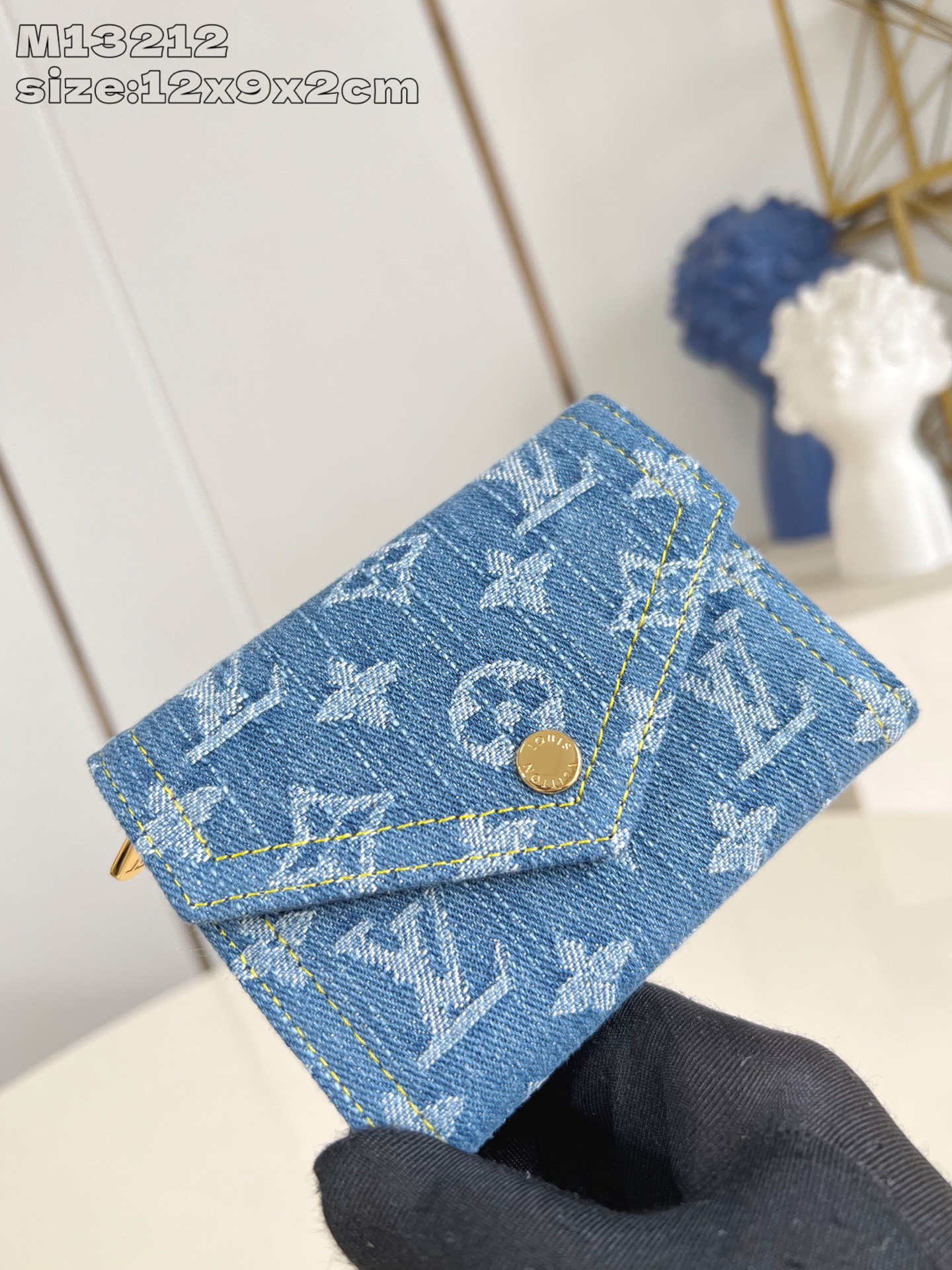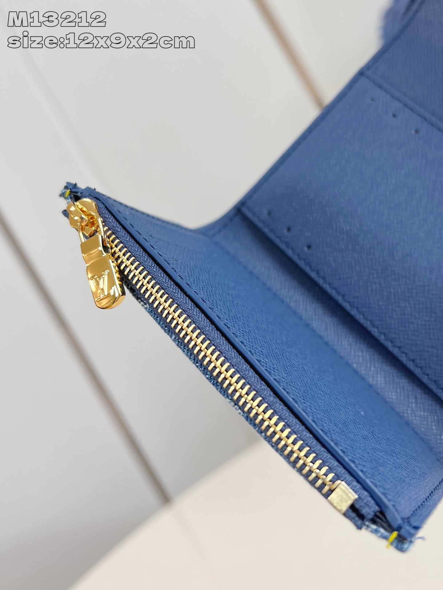 【顶级原单 M13212 】今季這款Monogram Denim系列的Victorine錢包以活潑的藍色設計,並採用有機棉質面料製作,內層配有皮革襯裡,並設有多個口袋及夾層,可妥善存放名片、紙幣及零錢,搭配金色按扣,更顯精緻。12 x 9.5 x 2.5 厘米 (長度 x 高度 x 闊度) .