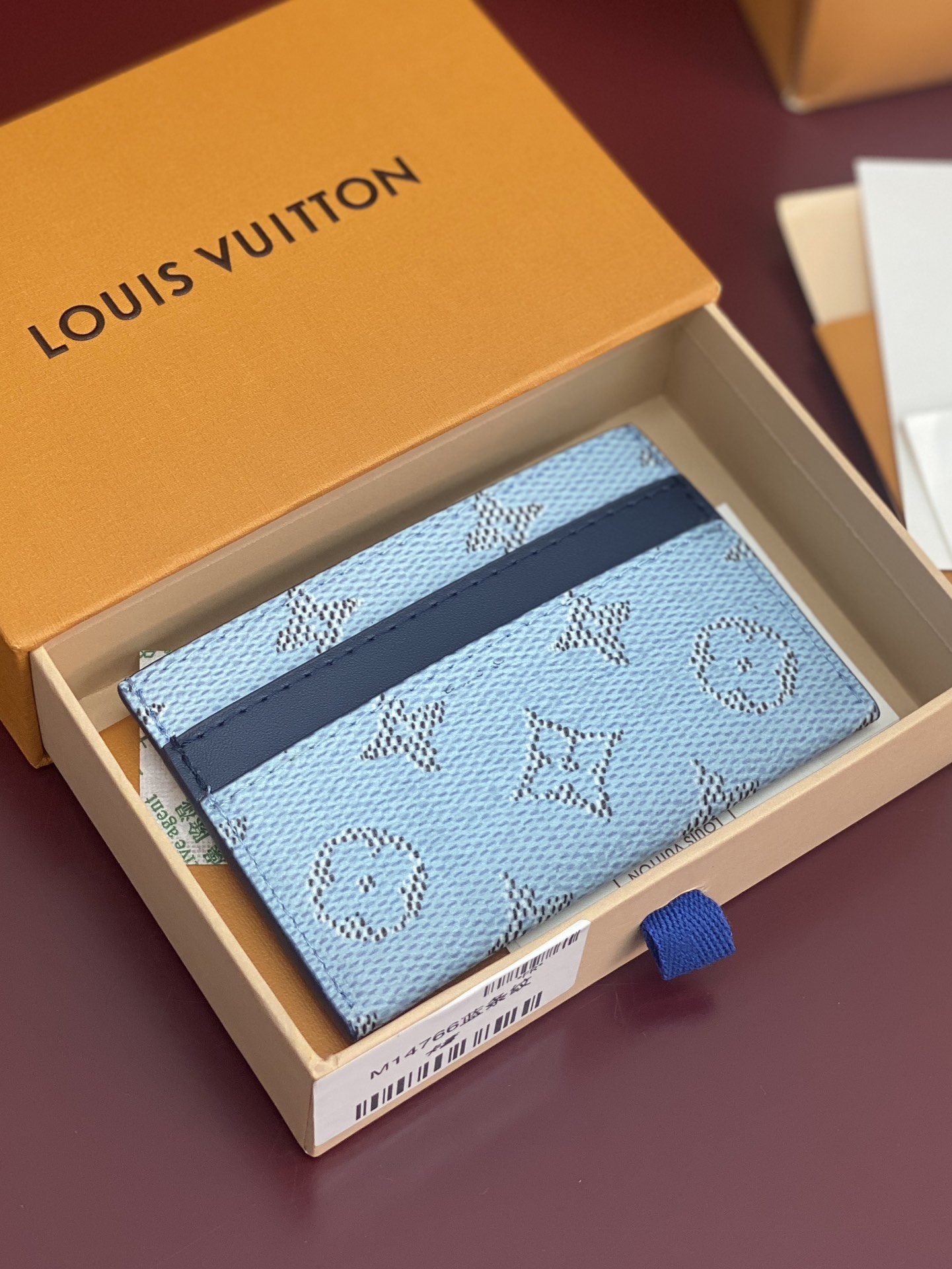 M14766 蓝条纹!雙面名片夾、這款雙面名片夾以Monogram Heritage塗層帆布製造,是Pharrell Williams對Monogram圖案的全新演繹。名片夾飾以原版設計Damier印花圖案的元素,包括經緯編織效果。名片夾綴以牛皮飾邊,正面飾以「Marque L. Vuitton Déposée」標誌,配備4個名片夾層及中央口袋,倍添實用。