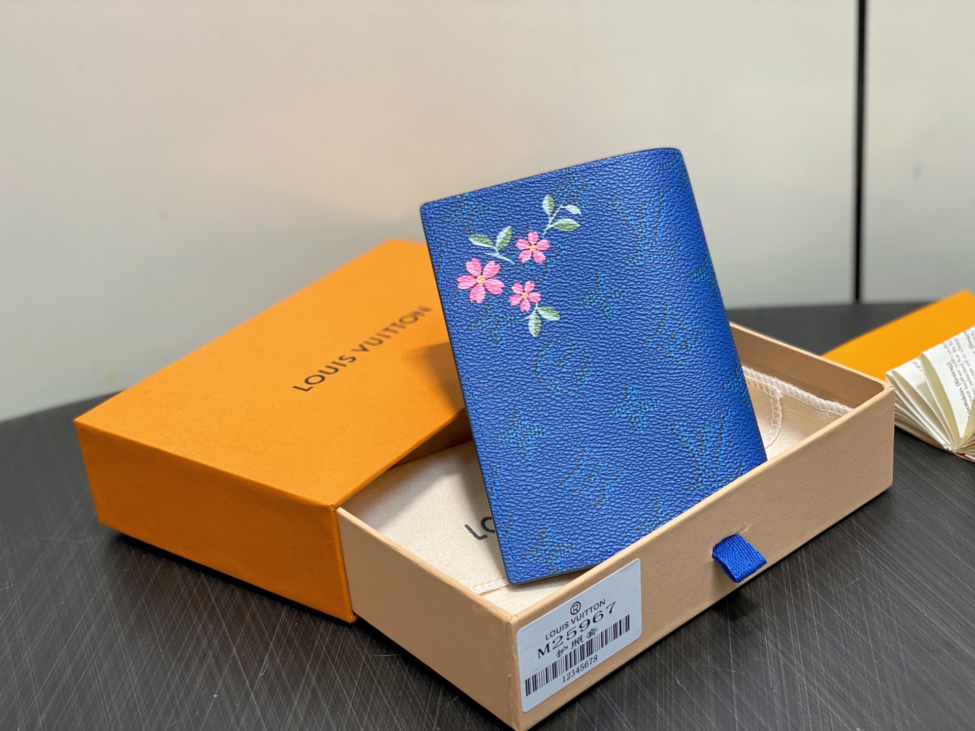 【顶级原单】M25967蓝色 印花护照夹护照套 EARLY ACCESS Lv nigo联名 Passport Cover 护照套 M25968粉色 受驻扎在日本的美军作为纪念他们在日本的纪念品夹克的启发,这款彩色Monogram帆布的护照封面具有生动的印花。这款实用的配件不仅可以容纳护照,还包括四个卡槽和一个用于存放纸张的扁平口袋。10.0 x 14.0 x 2.5 cm。.