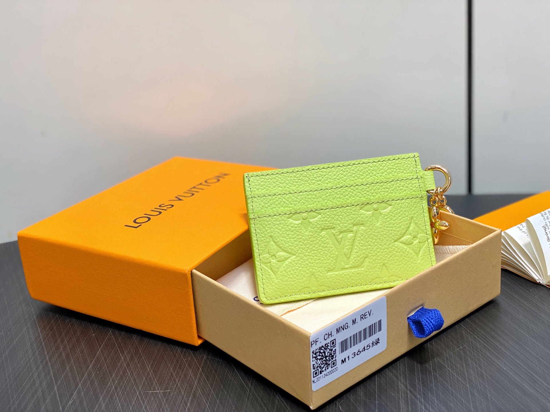 【顶级原单】M13645绿色 全皮卡包钱包 LV Charms 名片夹 M13647粉色 M13645绿色 M13649蓝色 这款精致的LV Charms名片夹能为任何配饰系列增添亮丽色彩。名片夹以品牌标志性的Monogram Empreinte皮革制造,缀有两颗Monogram花卉图案吊饰,分别以珐琅和金属铸造。功能格外实用,每面均设有两个外置夹层,中间更配备一个大型隔层,容量足以装载五张名片。10.2 x 7.3 x 0.3 厘米。.