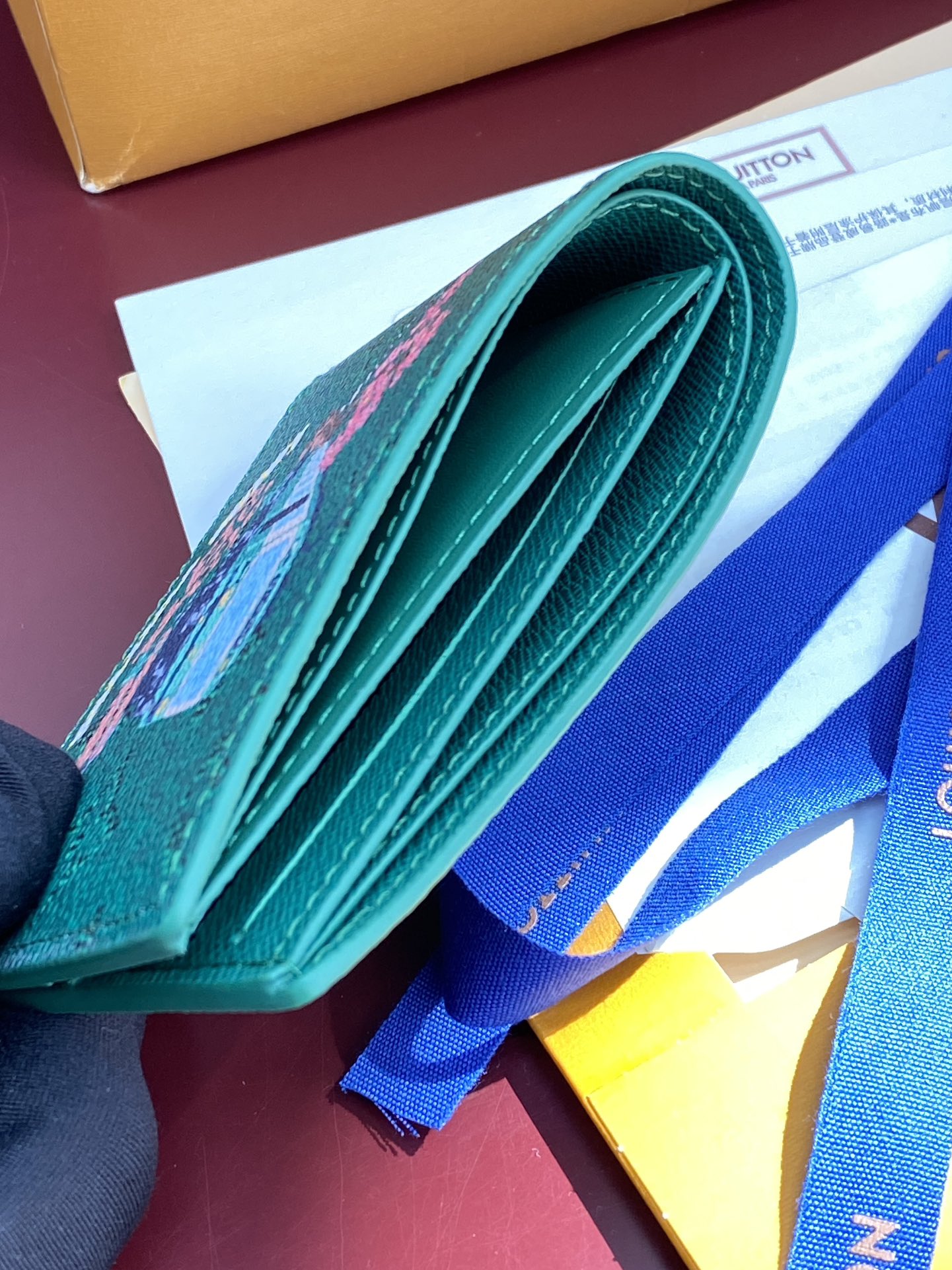 M25986 火车绿!Slender 錢包!這款Slender錢包採用彩色Monogram塗層帆布製作,以二戰末期駐日美軍為自己製作的紀念外套為靈感,且飾有印花圖案。小巧的錢包設有八個名片夾層及一個用於存放紙幣及票據的隔層。
