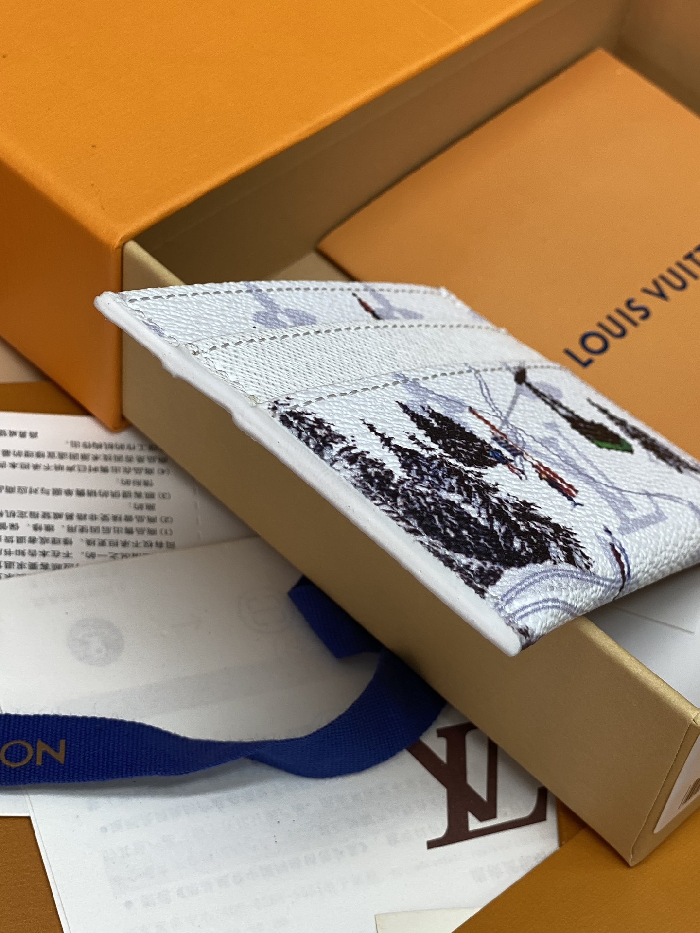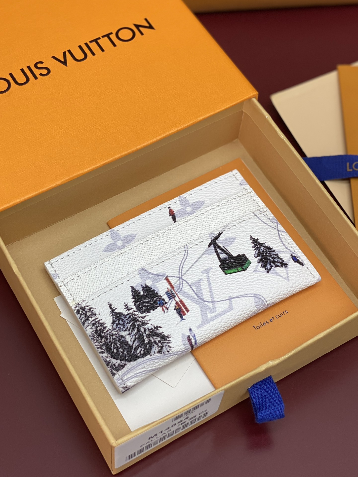 M14862 卡片夹!滑雪白色!DOUBLE 卡夹、本款 Double 卡夹出自父亲节系列,为 Colored Monogram 帆布融入袖珍运动场景印花,以牛皮革内衬完善经典格调。卡片夹层和中央口袋实现有序收纳。